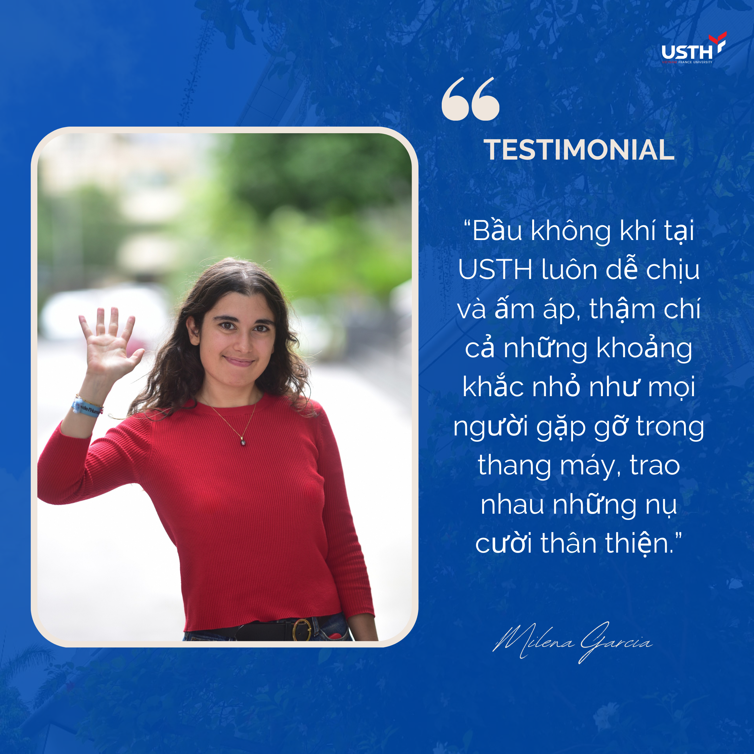 “Bầu không khí tại USTH luôn dễ chịu và ấm áp, thậm chí cả những khoảnh khắc nhỏ như mọi người gặp gỡ trong thang máy, trao nhau những nụ cười thân thiện”, Milena chia sẻ.