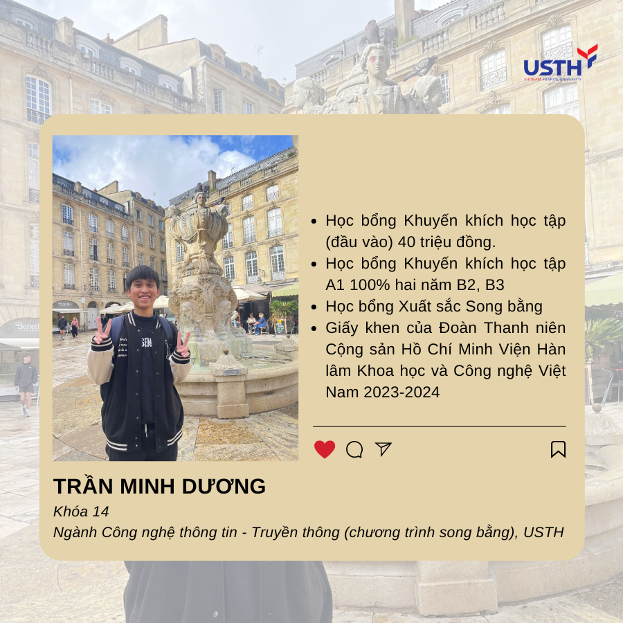 Ngay sau kỳ nghỉ hè đầy ý nghĩa đó, Dương tiếp tục lên đường sang Đại học La Rochelle (Pháp) để hoàn thành năm cuối theo chương trình Song bằng. Đây là lộ trình đào tạo đặc biệt cho phép sinh viên nhận cùng lúc hai tấm bằng đại học danh giá từ USTH và đối tác Pháp sau 3 năm học (với 2 năm đầu tại Việt Nam và năm cuối chuyển tiếp sang Pháp).