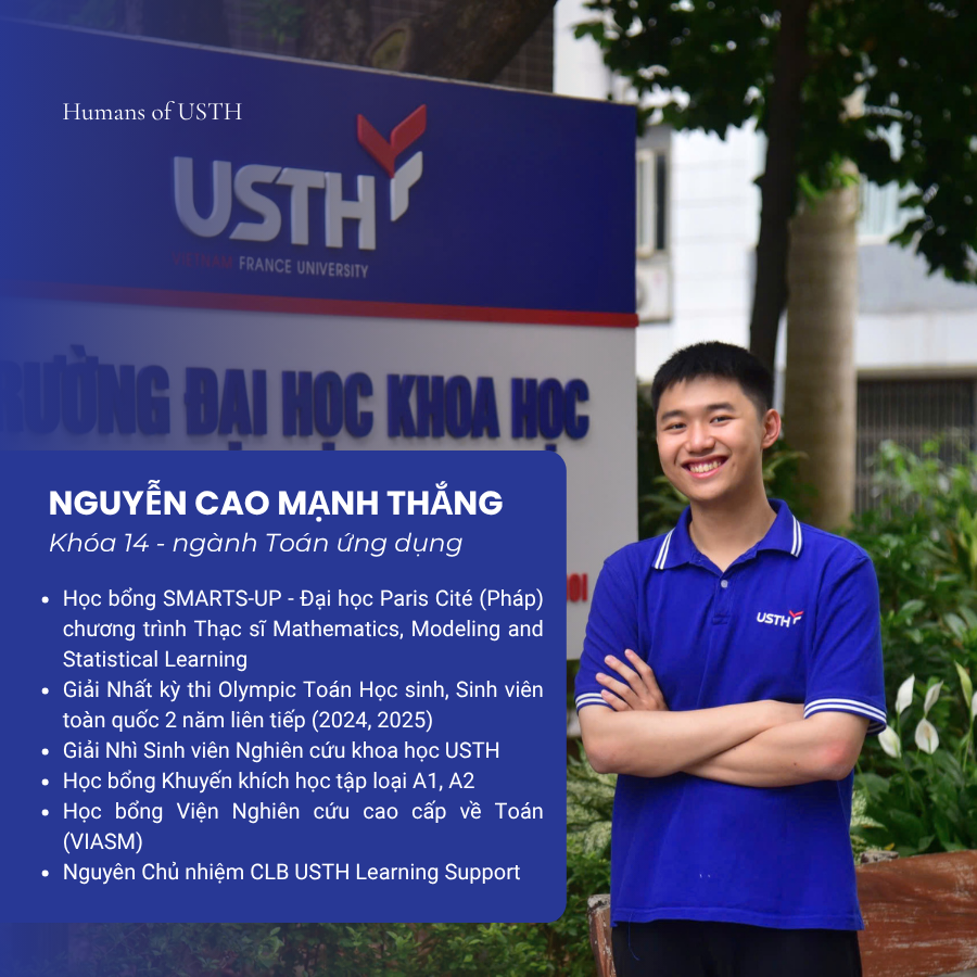 Rời bỏ lộ trình quen thuộc của một học sinh THPT Chuyên Ngoại ngữ, Nguyễn Cao Mạnh Thắng lại chọn giải mã cuộc sống thông qua những con số và mô hình toán học. Quyết định theo đuổi ngành Toán ứng dụng tại USTH đã mở ra cho Thắng một chương mới đầy rực rỡ, nơi cậu được “lớn” theo tốc độ của riêng mình. Từ những học bổng danh giá đến tấm vé đặt chân tới nước Pháp, chàng trai trẻ đã chứng minh rằng: khi chọn đúng bệ phóng, đam mê sẽ luôn tìm thấy lộ trình để tỏa sáng.