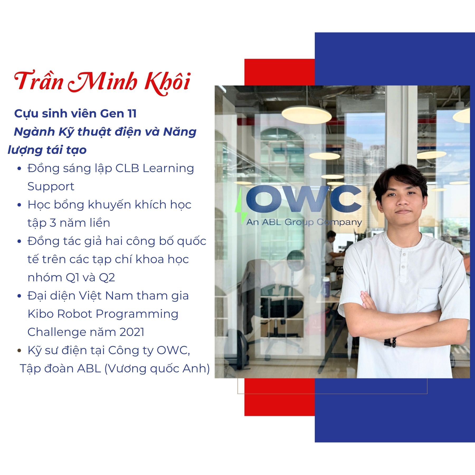 Hiện nay, Khôi đang đảm nhiệm vị trí kỹ sư điện tại OWC — công ty tư vấn năng lượng tái tạo thuộc Tập đoàn ABL (Vương quốc Anh), đơn vị tham gia phát triển nhiều dự án điện gió quy mô lớn trên thế giới. Công việc của cậu tập trung vào tư vấn thiết kế hệ thống, thực hiện các tính toán kỹ thuật và hỗ trợ xử lý những vấn đề phát sinh trong quá trình triển khai điện cho các dự án điện gió ngoài khơi.