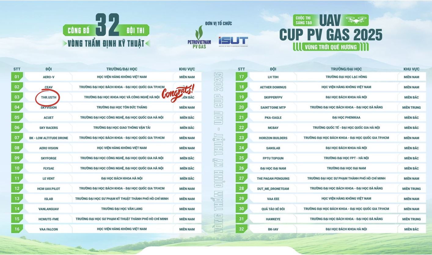 Đội tuyển Thr.USTH đến từ ngành Kỹ thuật Hàng không của Trường Đại học Khoa học và Công nghệ Hà Nội (USTH) xuất sắc vượt qua vòng sơ tuyển Cuộc thi “Sáng tạo UAV 2025 – Vùng trời quê hương” với vị trí thứ 3 trong Top 32 đội xuất sắc nhất.