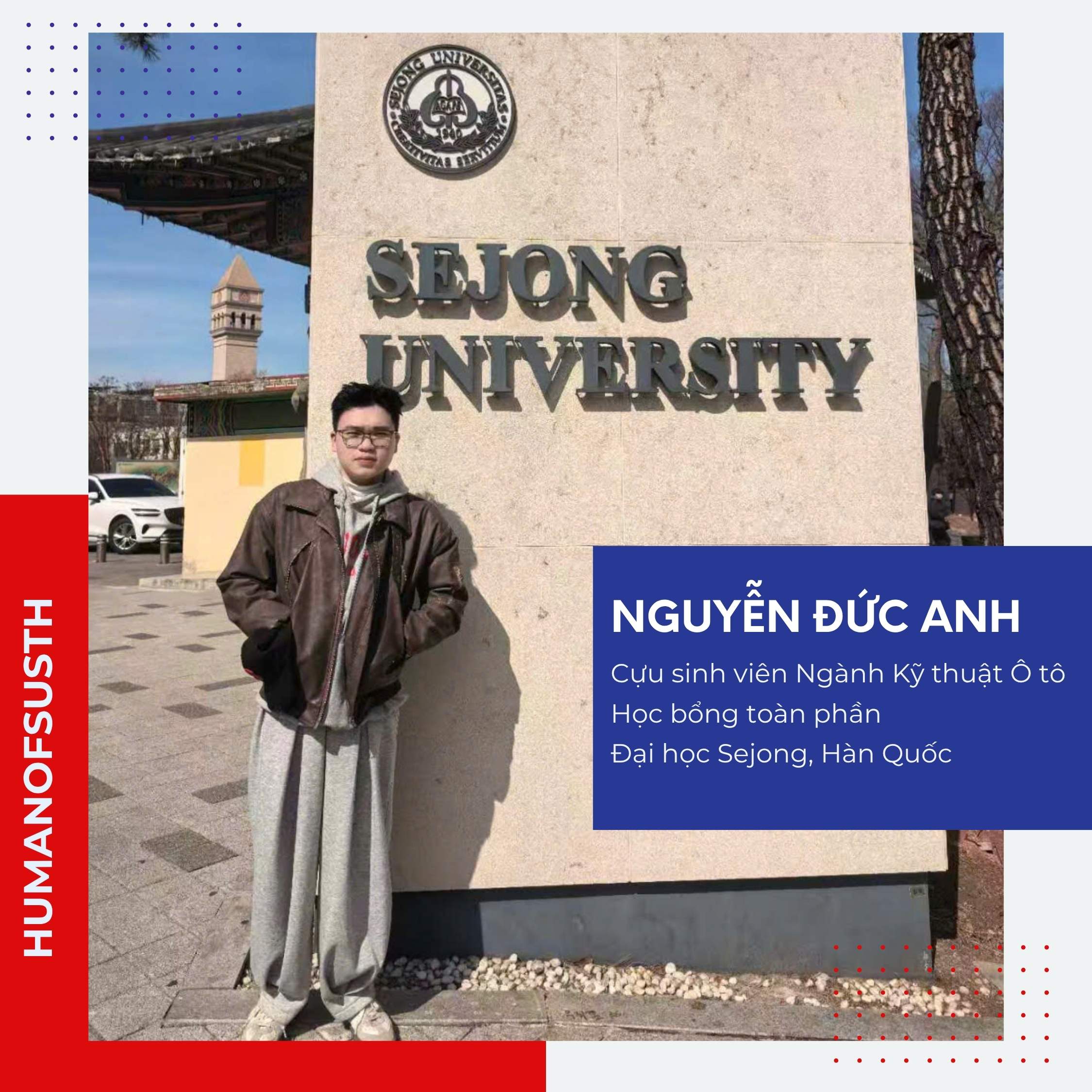 Có những tình yêu tựa như những hạt mầm, lặng lẽ vươn mình qua năm tháng. Đó cũng giống như tình yêu của Nguyễn Đức Anh – cựu sinh viên khóa 12, ngành Kỹ thuật Ô tô dành cho USTH. Từ những ngày đầu còn nhiều băn khoăn, lo lắng, hành trình học tập tại USTH đã mở ra cho chàng trai 2k3 nhiều cơ hội mới. Đức Anh đã giành học bổng toàn phần tại Đại học Sejong– một trong những trường đại học danh tiếng, thuộc top 10 tại Hàn Quốc.