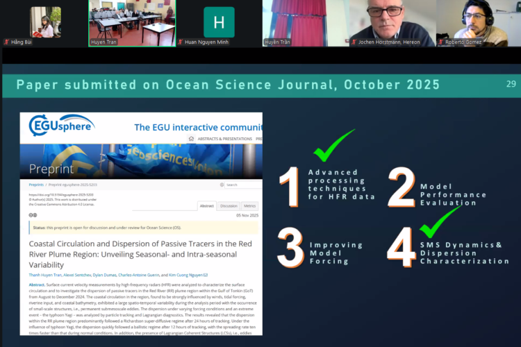 Her research focused on the dynamics of SMS currents in two Vietnamese coastal regions: the deep coastal waters of Central–Southern Vietnam and the shallow waters around the Red River estuary in the Gulf of Tonkin. In the Red River estuary area, the research team employed high-frequency (HF) radar and advanced processing techniques to collect high-quality surface current data. These data helped clarify seasonal and intra-seasonal variations of SMS processes, as well as the impacts of small-scale dynamics on the dispersion of suspended and dissolved materials in coastal waters. Overall, the study demonstrates that HF radar is highly effective for monitoring coastal currents and significantly enhances understanding of submesoscale current variability and material transport processes in different Vietnamese coastal regions.