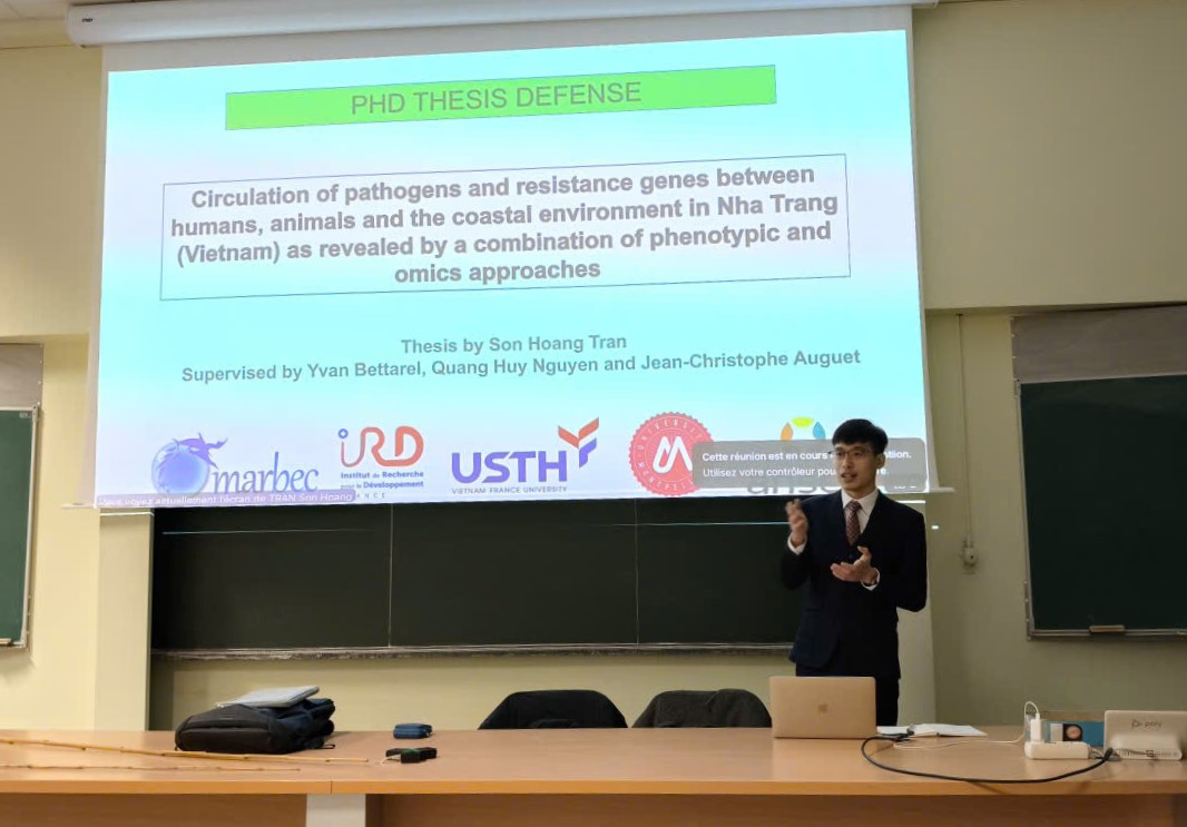 On December 11, 2025, PhD candidate Tran Son Hoang, specializing in Pharmaceutical, Medical, and Agricultural Biotechnology, successfully defended his doctoral dissertation entitled “Circulation of pathogens and resistance genes between humans, animals, and the coastal environment in Nha Trang (Viet Nam), as revealed by a combination of phenotypic and omics approaches.”