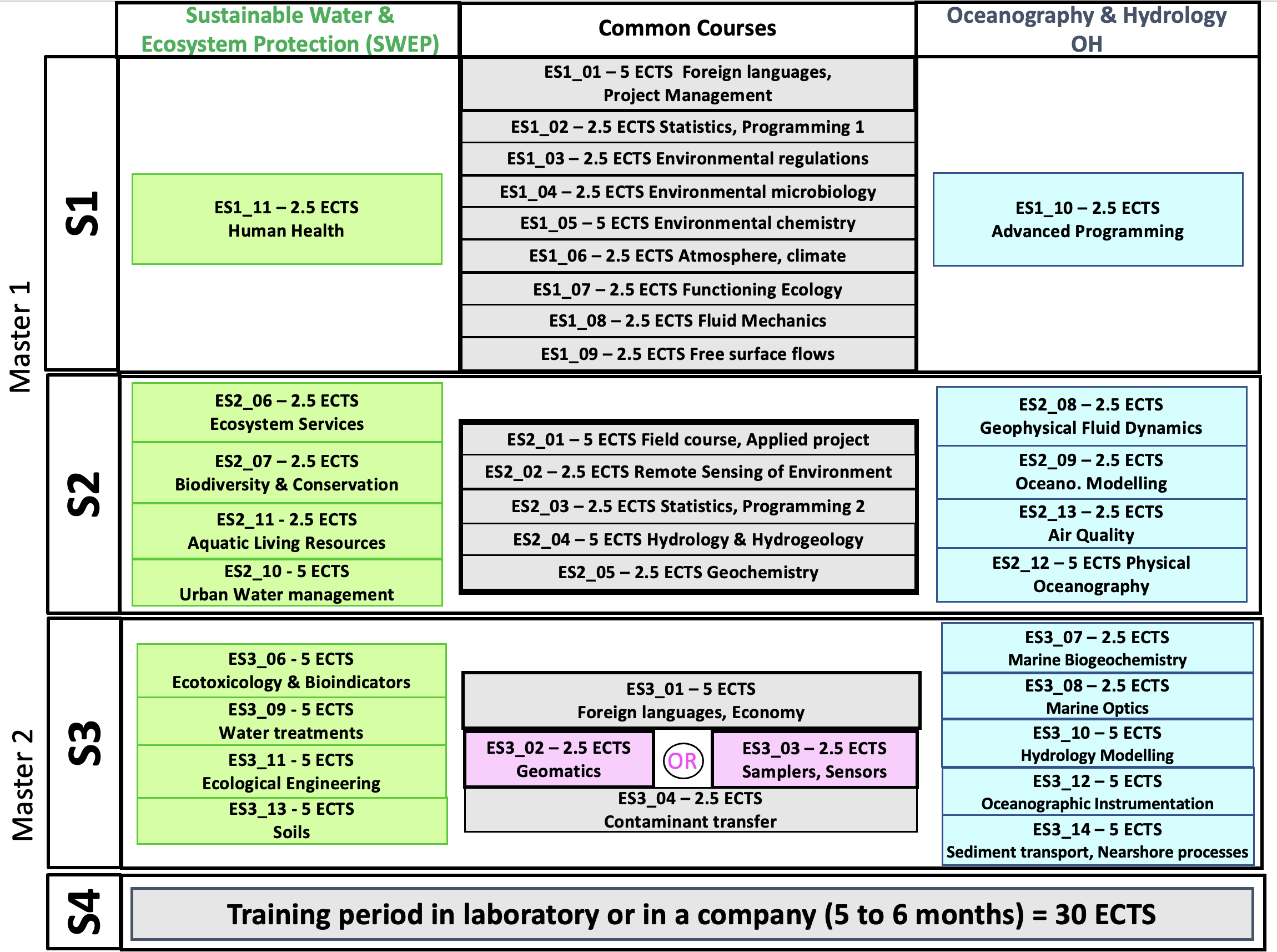 To meet these needs, the program offers two specialized tracks: Sustainable Water and Ecosystem Protection (SWEP) and Oceanography and Hydrology (OH). A shared core curriculum provides all students with a solid foundation in environmental sciences, combining theoretical knowledge with hands-on and technical experience.