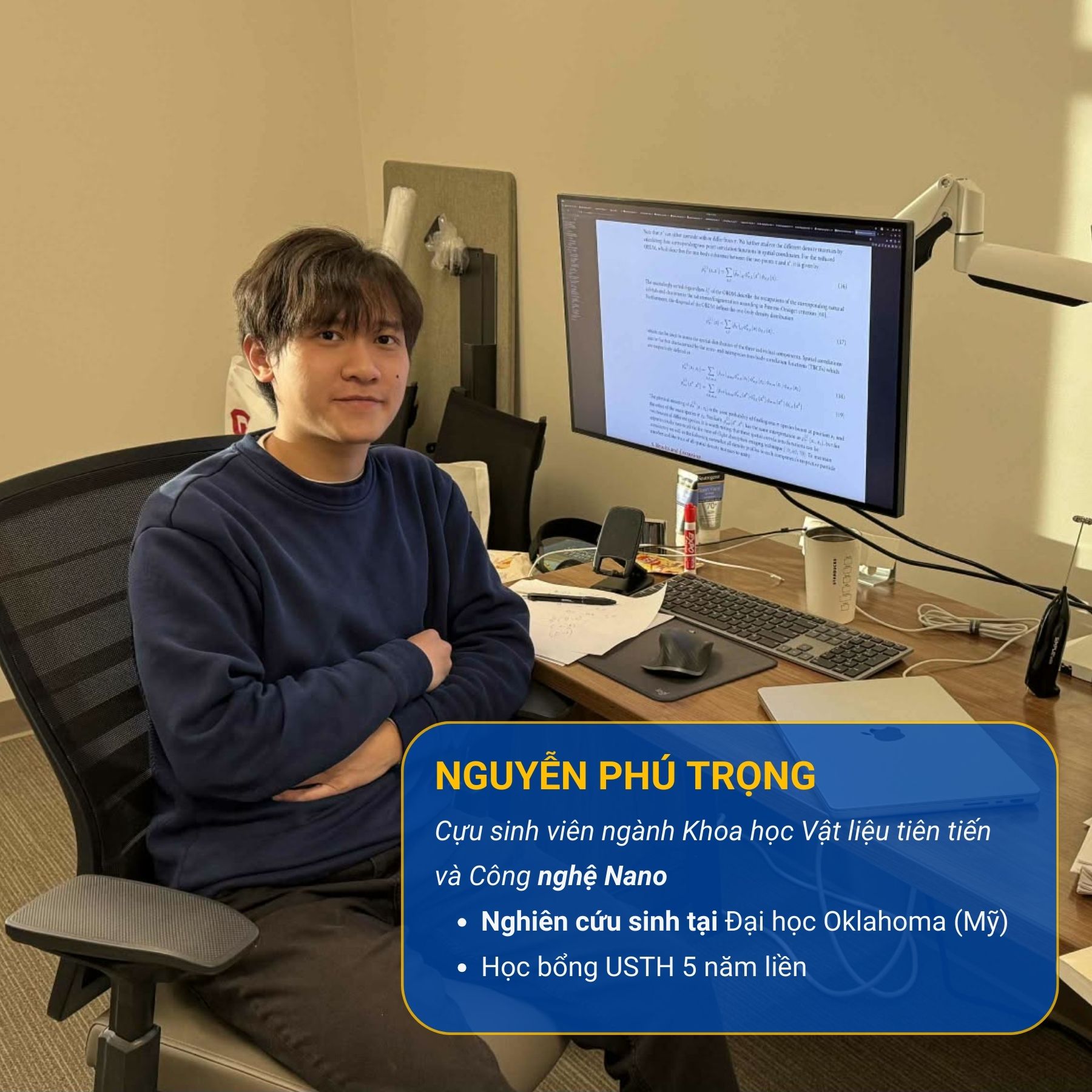 Gắn bó trọn vẹn 5 năm học tập tại USTH, tình yêu của Nguyễn Phú Trọng dành cho ngôi trường nhỏ nhắn nằm trong khuôn viên Viện Hàn lâm Khoa học và Công nghệ Việt Nam được bồi đắp từ một môi trường học thuật gần gũi, nơi thầy cô không chỉ là người hướng dẫn nghiên cứu mà còn là những người bạn “tâm giao”. Chính nền tảng ấy đã giúp cựu học viên ngành Khoa học vật liệu tiên tiến và Công nghệ Nano tự tin bước ra thế giới, tiếp tục chinh phục chân trời tri thức mới  tại Đại học Oklahoma (Mỹ) – một trong những trường đại học công lập danh tiếng hàng đầu nước Mỹ.