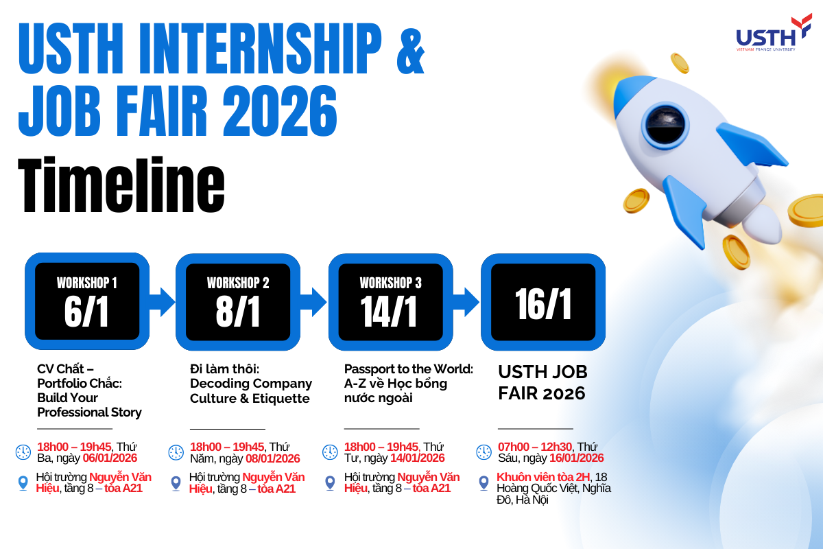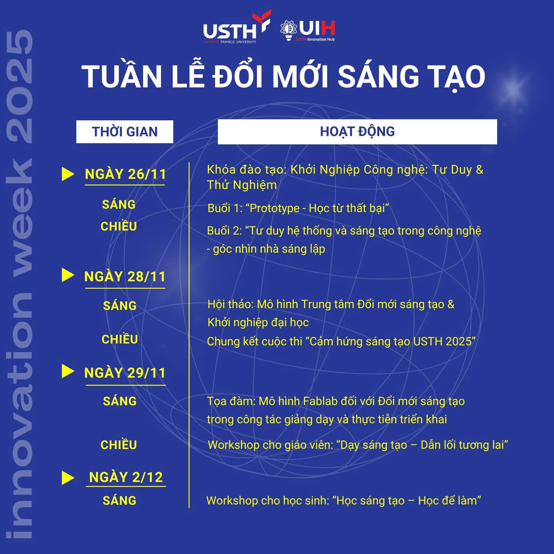 Tuần lễ Đổi mới Sáng tạo USTH 2025 do Trung tâm Đổi mới sáng tạo và Khởi nghiệp USTH (UIH) chủ trì triển khai, quy tụ nhiều sự kiện được tổ chức liên tục, mỗi hoạt động mang một vai trò riêng trong việc xây dựng năng lực đổi mới của người học.