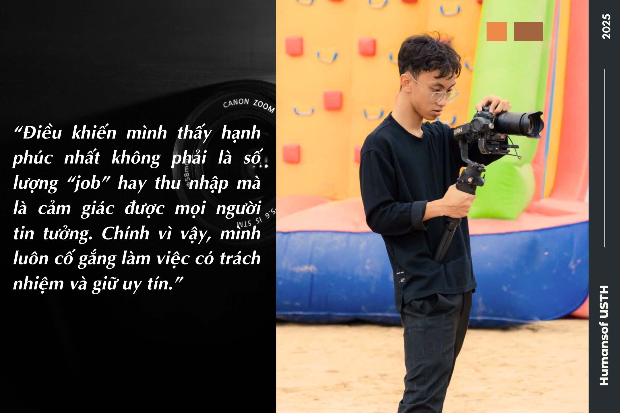 Phúc cũng lập một “team” nhỏ cùng những người bạn có chung niềm đam mê để cùng nhau phát triển. Theo cậu bạn, những kinh nghiệm khi làm công việc luôn quan đến nhiếp ảnh và quay chụp mang đến không chỉ nguồn thu nhập ổn định để tự trang trải học phí và sinh hoạt phí khi đi học xa nhà, mà còn nhiều bài học quý giá về giao tiếp, quản lý thời gian và tinh thần làm việc nhóm.