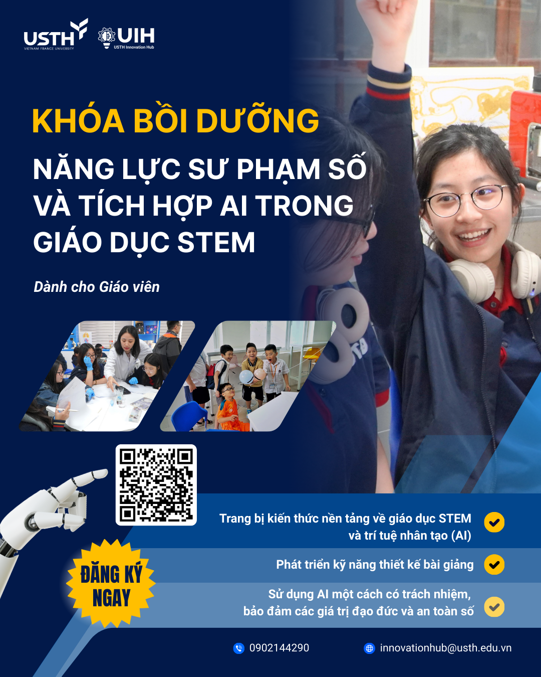 Khóa Bồi dưỡng năng lực sư phạm số và tích hợp AI trong giáo dục STEM https://usth.edu.vn/khoa-boi-duong-nang-luc-su-pham-so-va-tich-hop-ai-trong-giao-duc-stem-29438/ https://usth.edu.vn/khoa-boi-duong-nang-luc-su-pham-so-va-tich-hop-ai-trong-giao-duc-stem-29438/#respond Thu, 22 Jan 2026 07:09:31 +0000 https://usth.edu.vn/?p=29438 Chương trình “Bồi dưỡng năng lực sư phạm số và tích hợp AI trong giáo dục STEM” được xây dựng trên cơ sở định hướng đổi mới giáo dục của Bộ Giáo dục và Đào tạo, hướng tới gắn kết giáo dục STEM thực nghiệm với những kiến thức nền tảng về trí tuệ nhân […]