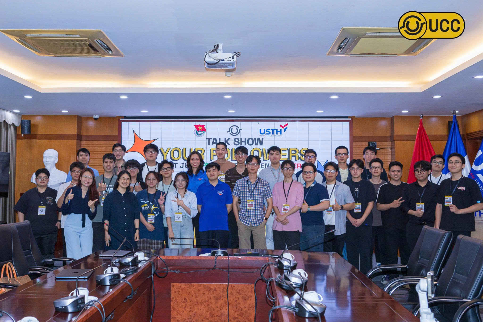 Nguyễn Đức Minh (hàng trước, thứ sáu từ phải sang) cùng các thành viên USTH Coder Club trong buổi talkshow YOUR FOLLOWERS NOT JUST FRIENDS, BUT EVEN HACKERS của UCC