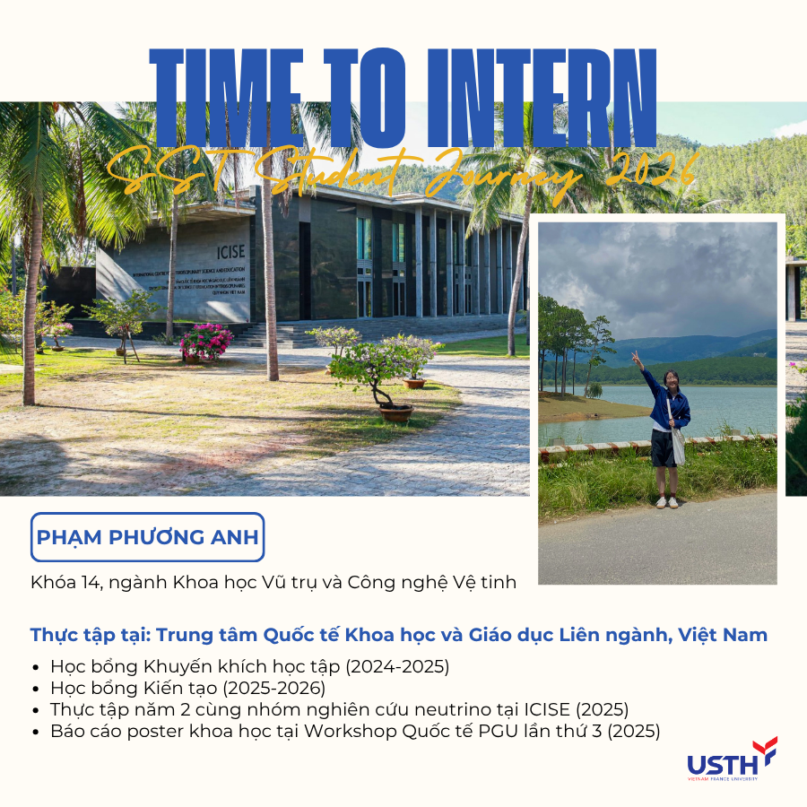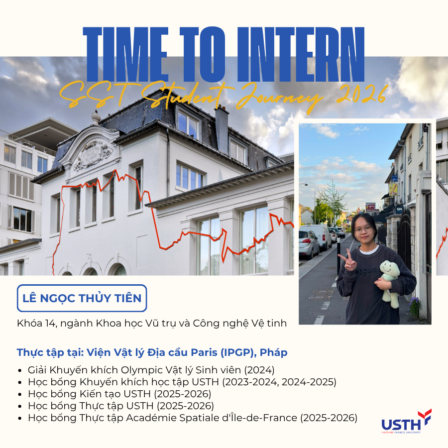 Mùa thực tập năm nay đã chính thức “chuyển động”, đưa các “chiến binh” SST từ giảng đường USTH vươn ra những viện nghiên cứu danh giá nhất tại Pháp, và cả những đơn vị đầu ngành ngay tại Việt Nam. Đằng sau những tấm vé bay đến đất nước hình lục lăng hay những vị trí nghiên cứu “xịn sò” trong nước, là 5 câu chuyện, 5 cá tính và những cú “liều” đầy bản lĩnh. Mỗi chuyến đi là một quỹ đạo riêng, nhưng tất cả đều bắt đầu từ bệ phóng chung mang tên Khoa học Vũ trụ và Công nghệ Vệ tinh – USTH.