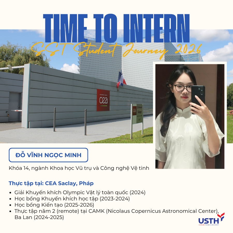 Từng đối mặt với sự lo lắng của gia đình khi theo đuổi một lĩnh vực mới mẻ và có phần “khó hình dung” về tương lai, Đỗ Vĩnh Ngọc Minh đã chọn cách dùng hành động để chứng minh. Thay vì lùi bước, nữ sinh USTH đã nỗ lực không ngừng để nắm bắt tấm vé thực tập tại CEA Saclay (Pháp) – một trong những trung tâm nghiên cứu năng lượng hạt nhân và khoa học đa ngành lớn nhất Châu Âu. Với Minh, đây không chỉ là một kỳ thực tập đơn thuần mà là hành trình hiện thực hóa những câu hỏi tò mò về bầu trời đêm thuở nhỏ thành một sự nghiệp nghiên cứu chuyên nghiệp tầm cỡ quốc tế.