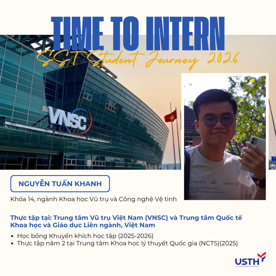 Với Nguyễn Tuấn Khanh, áp lực không phải là rào cản mà là tín hiệu cho sự trưởng thành. Lựa chọn thực tập tại Trung tâm Vũ trụ Việt Nam (VNSC) và ICISE, Khanh tận dụng tối đa đặc quyền của một sinh viên được làm việc trực tiếp cùng những người thầy đang dẫn đầu lĩnh vực tại Việt Nam. Thay vì chỉ tiếp cận kiến thức qua các công trình trên các tạp chí uy tín quốc tế, việc được thảo luận và nhận phản hồi tức thì từ các chuyên gia đầu ngành trong một môi trường thực tế đã giúp Khanh bồi dưỡng nền tảng vững chắc cho sự nghiệp nghiên cứu chuyên nghiệp trong tương lai.