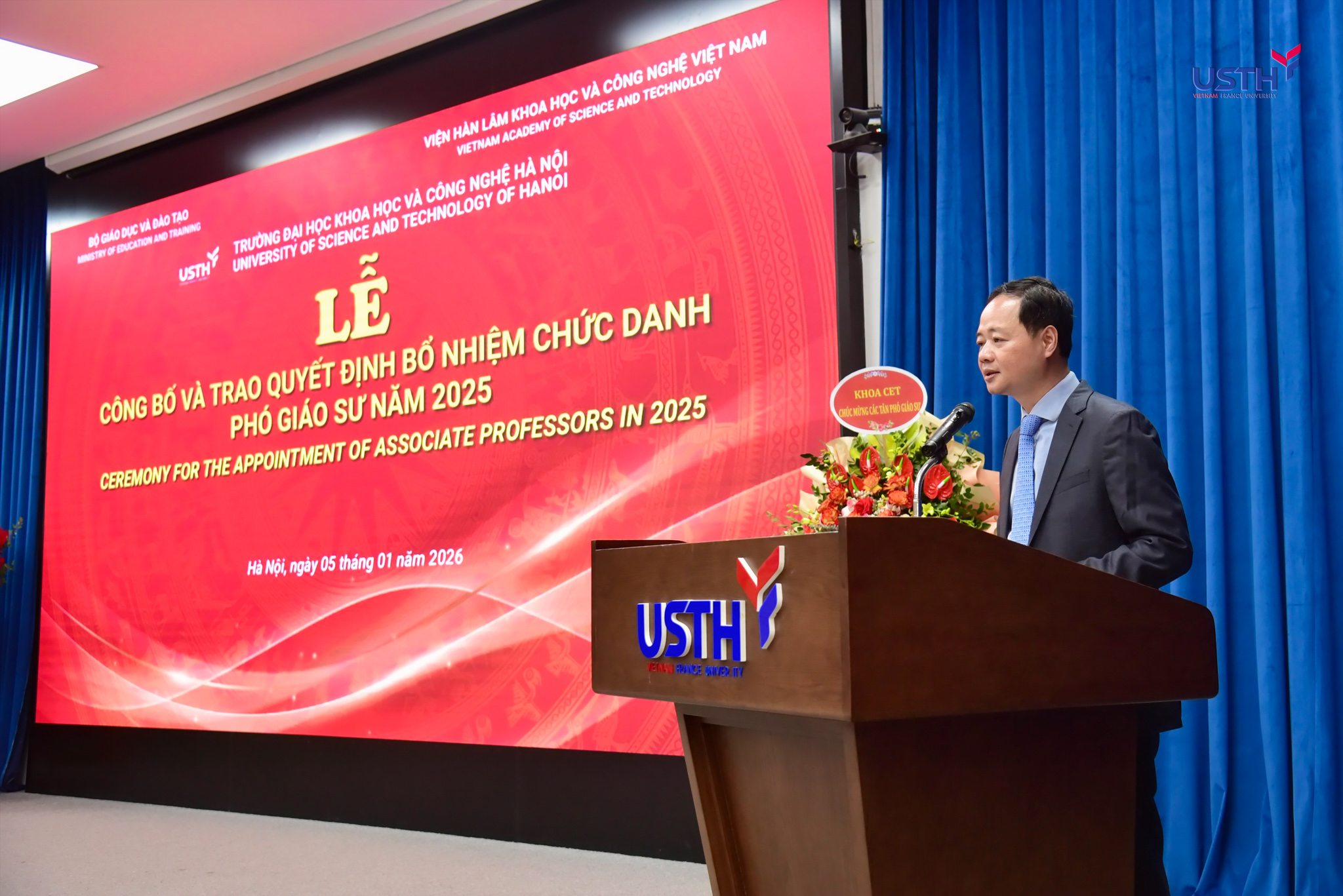 Ông khẳng định chức danh Phó Giáo sư không chỉ ghi nhận những nỗ lực không ngừng của các giảng viên – nhà khoa học trong hoạt động giảng dạy và nghiên cứu, mà còn đánh dấu điểm khởi đầu của một giai đoạn mới với yêu cầu cao hơn về trách nhiệm. Ông bày tỏ mong muốn các Phó Giáo sư sẽ ngày càng khẳng định vai trò nòng cốt trong công tác nghiên cứu khoa học, hình thành các nhóm nghiên cứu mạnh, phát triển các hướng nghiên cứu chuyên sâu, đóng góp mạnh mẽ hơn nữa vào sự phát triển của USTH nói riêng và Viện Hàn lâm nói chung.