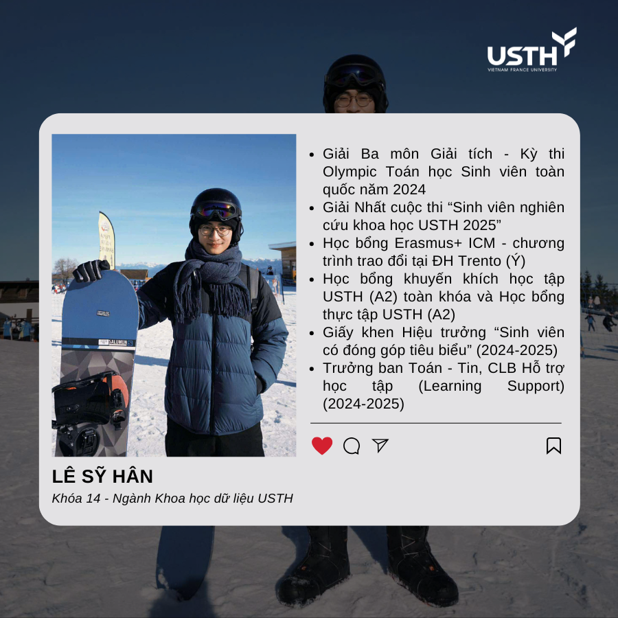 Lê Sỹ Hân, chàng sinh viên Khóa 14 ngành Khoa học Dữ liệu tại Trường Đại học Khoa học và Công nghệ Hà Nội (USTH), đã xuất sắc giành học bổng danh giá Erasmus+ ICM cho kỳ trao đổi tại Đại học Trento (Ý). Với Hân, đây không chỉ là một cột mốc học thuật, mà là hành trình năm tháng sống trọn vẹn giữa châu Âu – nơi những con số khô khan nhường chỗ cho những rung cảm sâu sắc trước vẻ đẹp của văn hóa và sự trưởng thành của bản thân.
