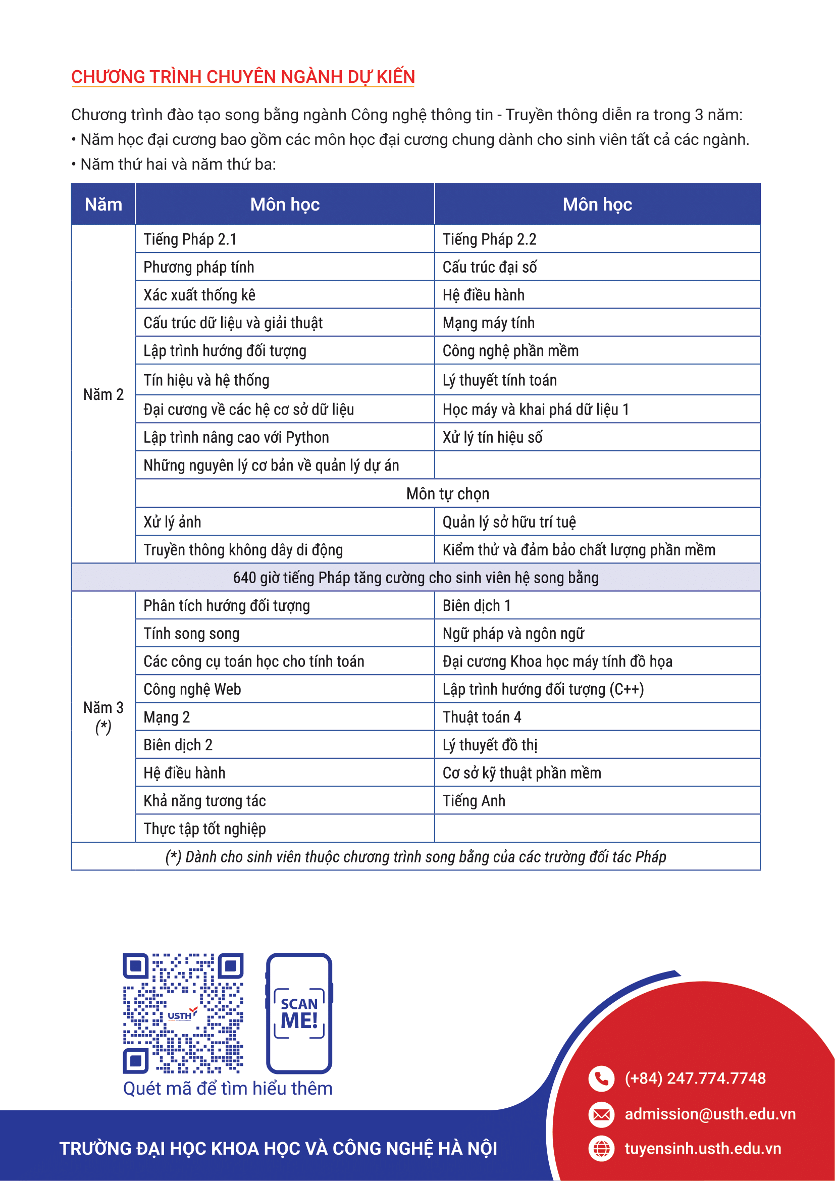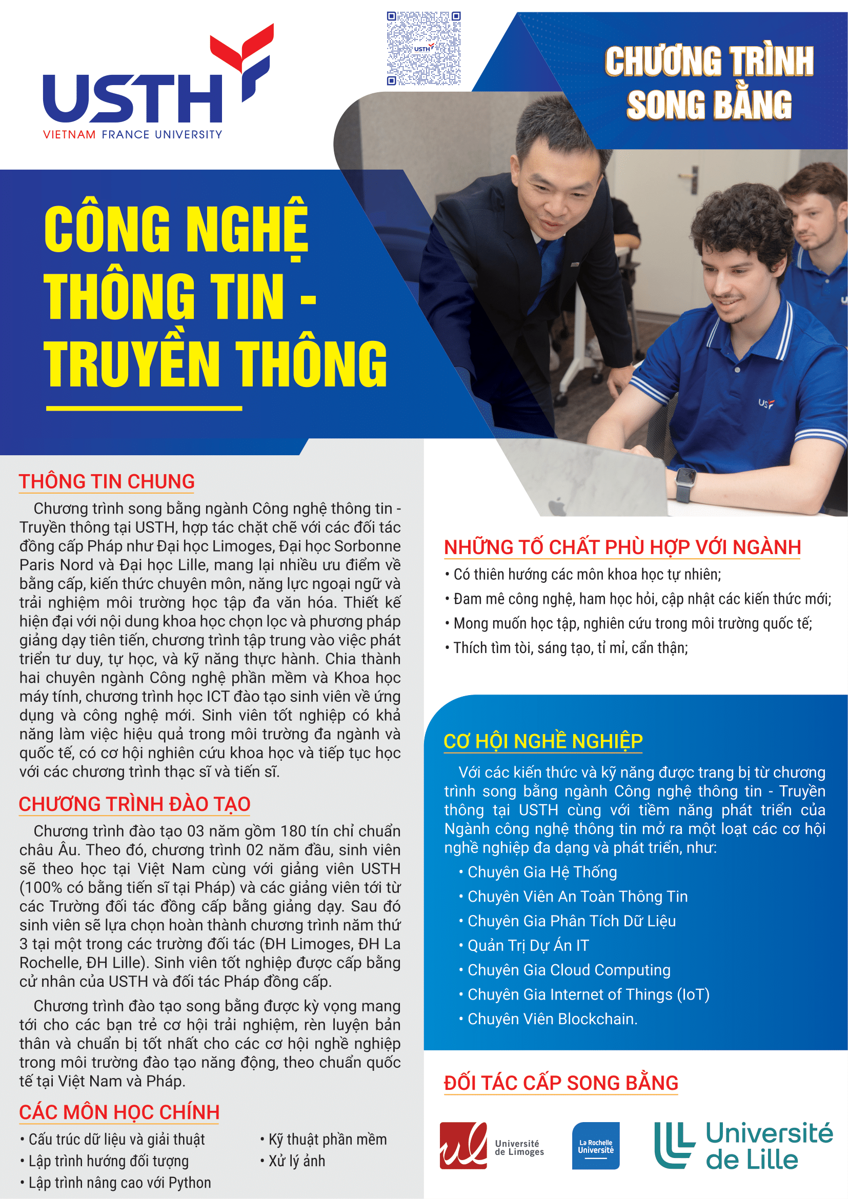 Với đối tác đồng cấp bằng là các trường Đại học uy tín tại Pháp, chương trình đào tạo song bằng cử nhân Công nghệ thông tin và Truyền thông tại USTH mang đến nhiều lợi thế về bằng cấp, kiến thức chuyên môn, năng lực ngoại ngữ và trải nghiệm du học sớm cho sinh viên.