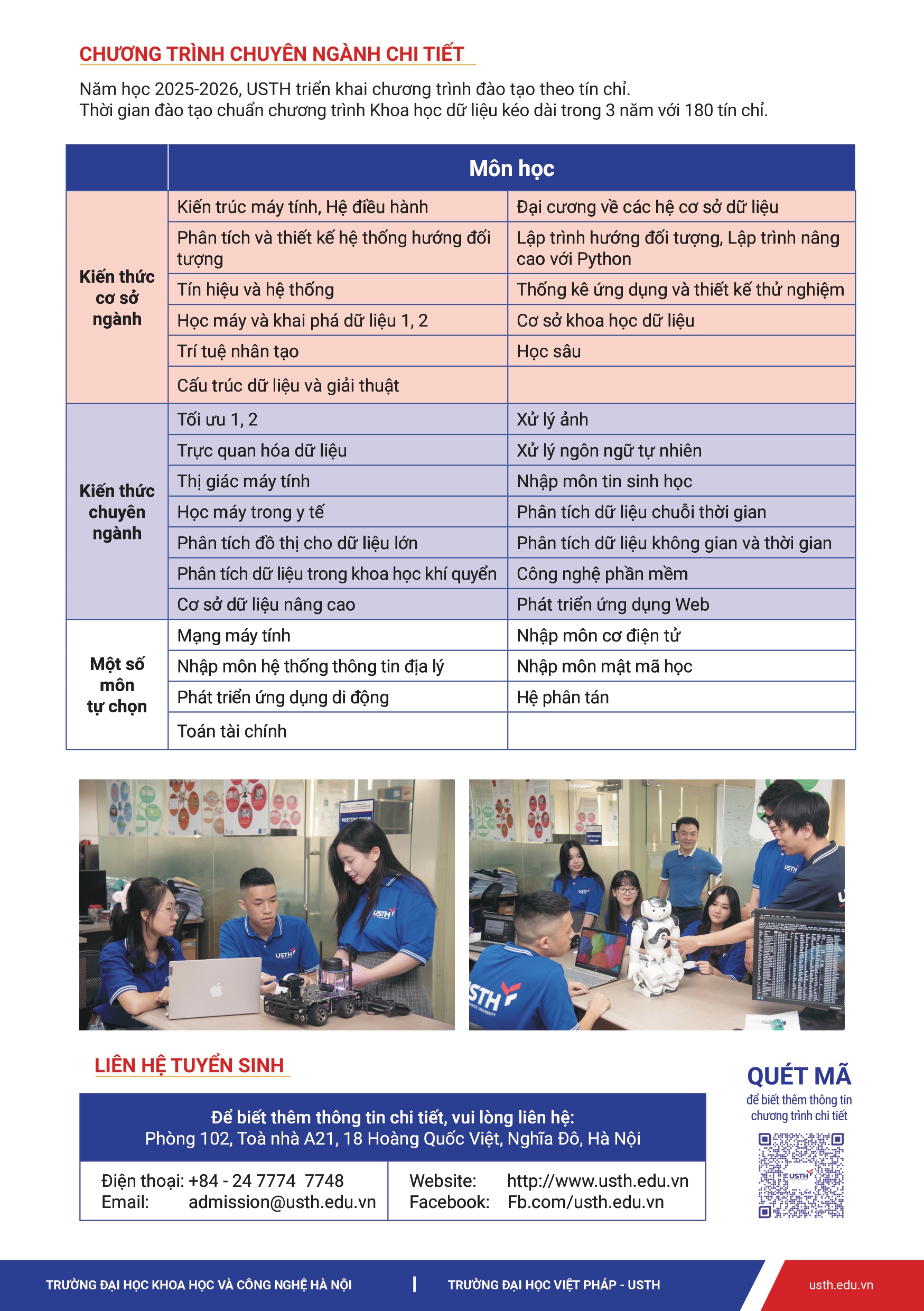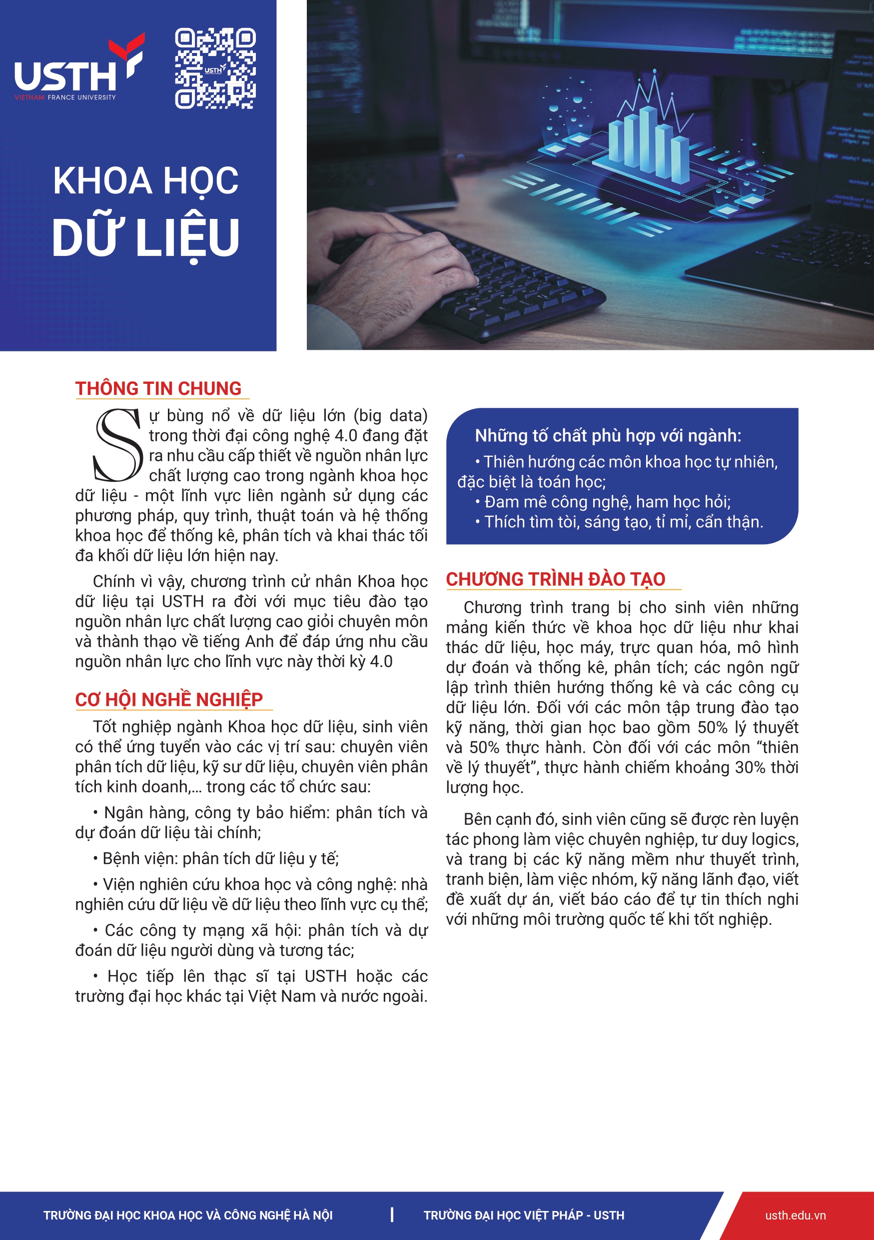 Dựa trên những thế mạnh trong đào tạo về Công nghệ thông tin cũng như thống kê, phân tích dữ liệu lớn trong các ngành về khoa học – công nghệ, USTH ra mắt chương trình cử nhân Khoa học dữ liệu giảng dạy bằng tiếng Anh để đáp ứng nhu cầu về nguồn nhân lực mới của thời kỳ 4.0.