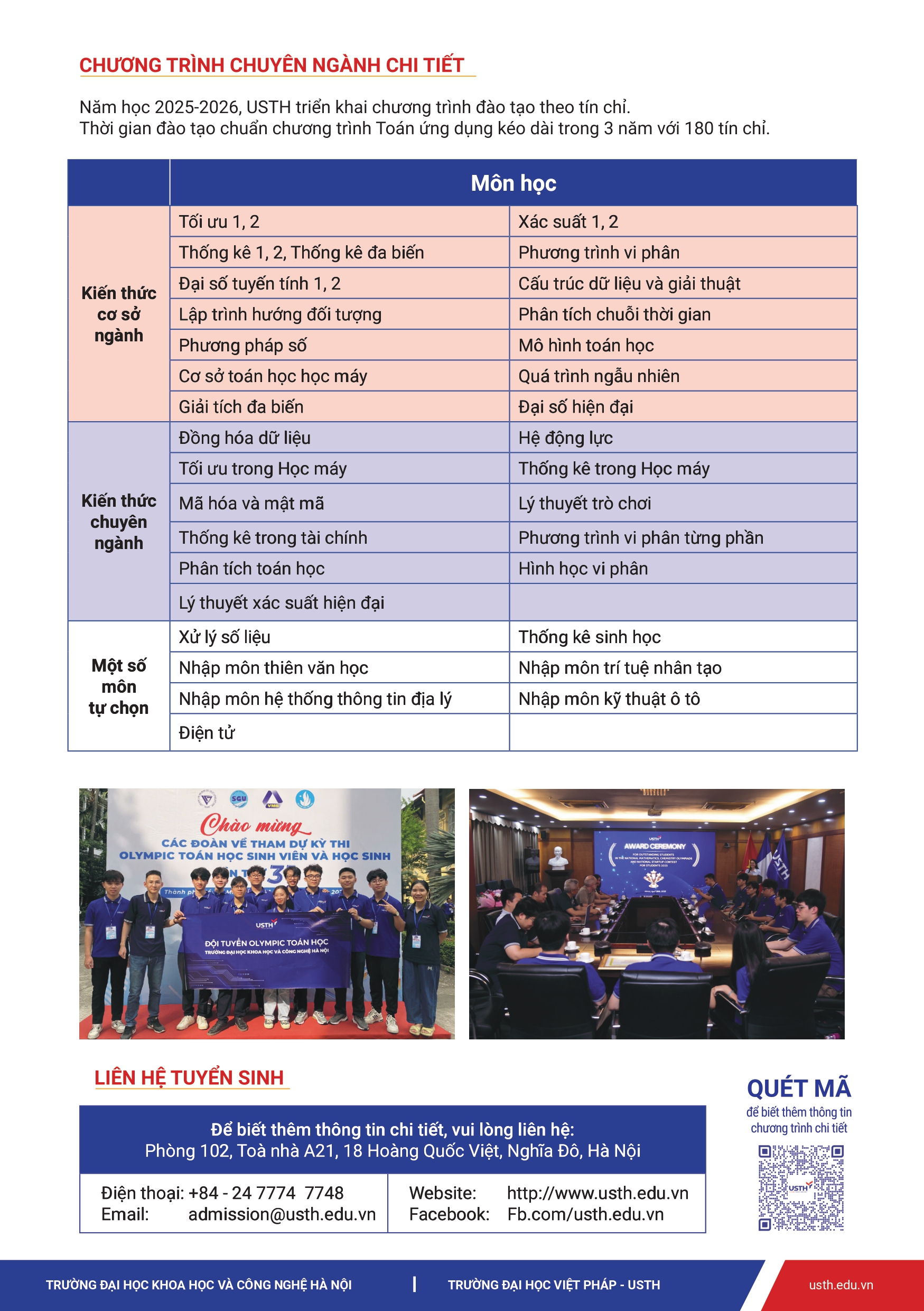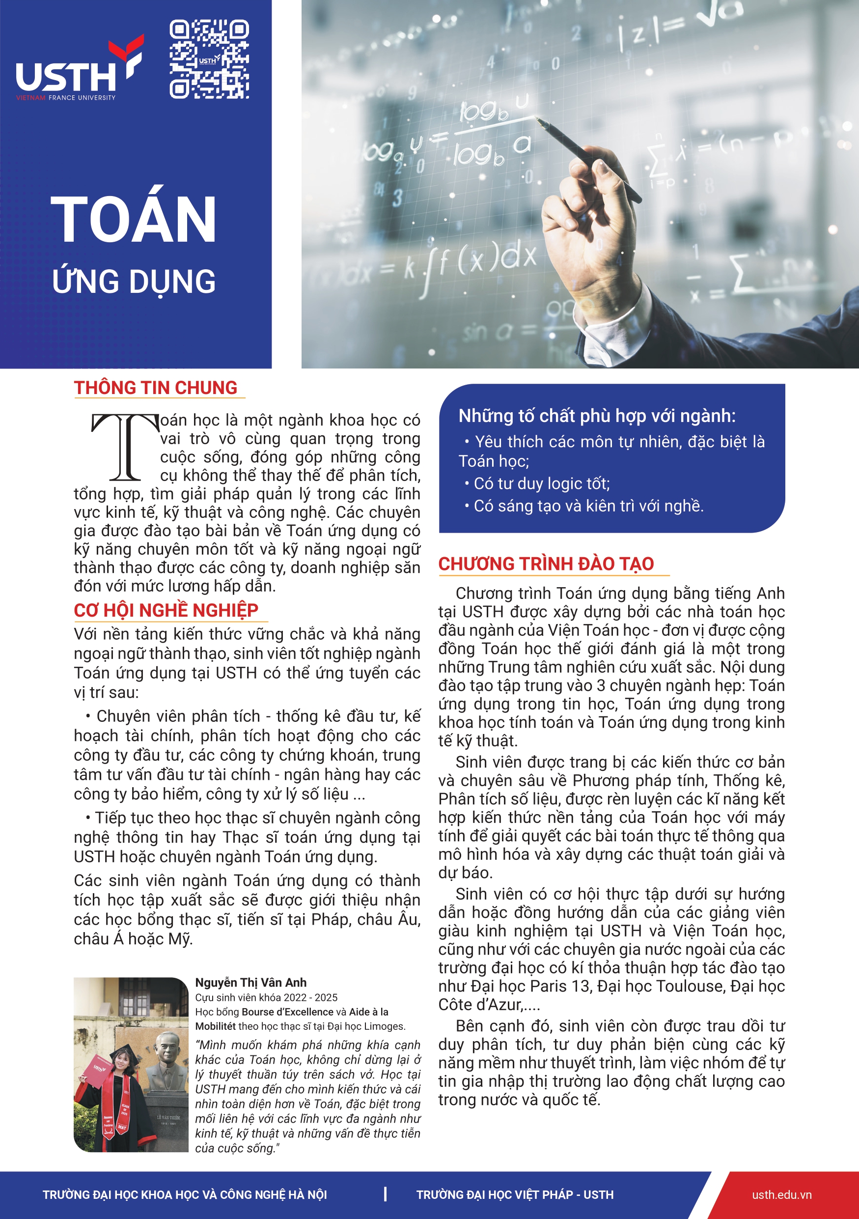- Tiếp tục theo học thạc sĩ chuyên ngành Công nghệ thông tin hoặc Tài chính tính toán định lượng tại USTH hoặc ngành Toán ứng dụng tại Trung tâm quốc tế UNESCO, Viện Toán học.