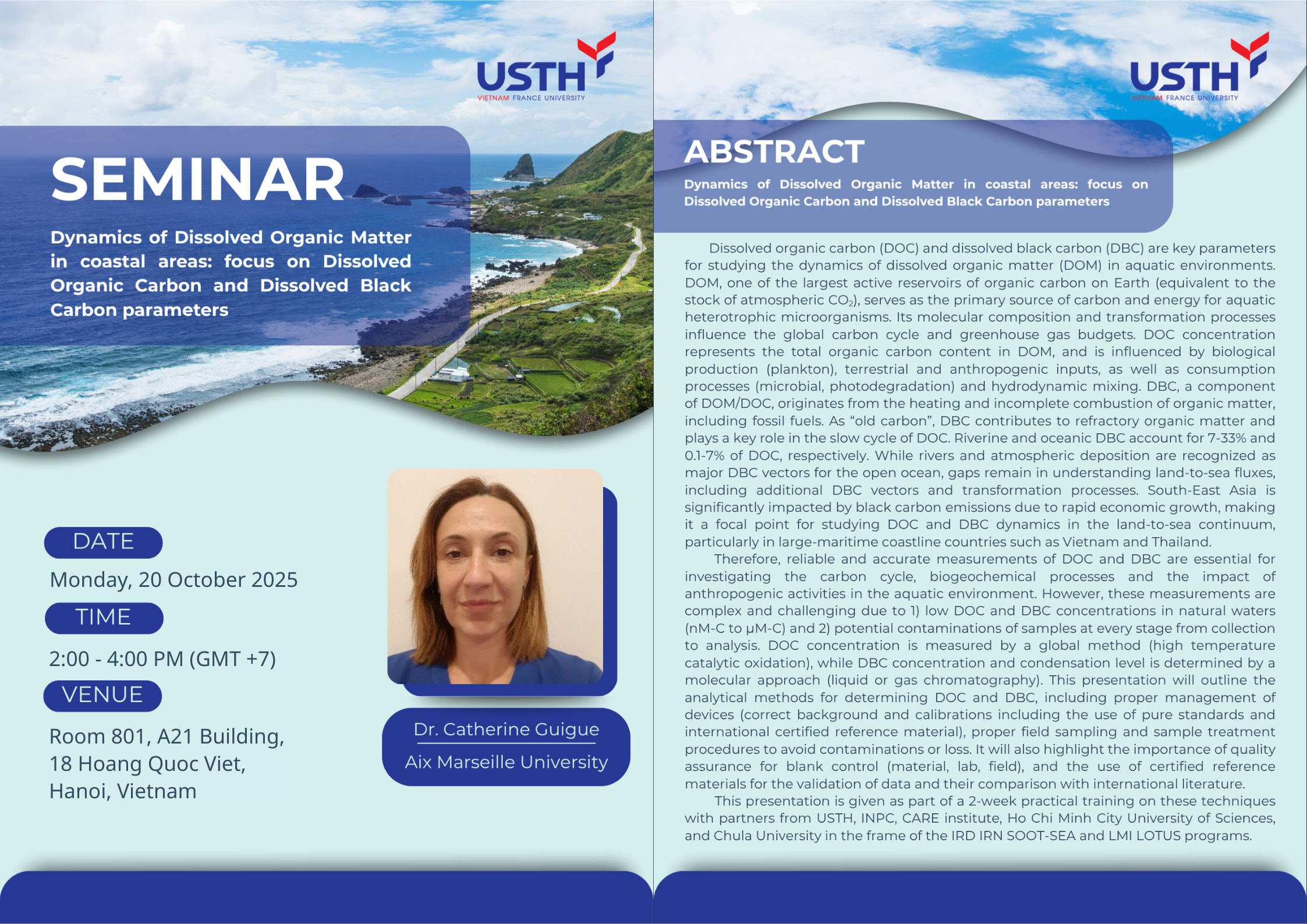 Ngày 20/10/2025, Trường Đại học Khoa học và Công nghệ Hà Nội (USTH) hân hạnh chào đón TS. Catherine Guigue – Aix Marseille University (Pháp) đến chia sẻ trong seminar với chủ đề “Dynamics of Dissolved Organic Matter in Coastal Areas: Focus on Dissolved Organic Carbon and Dissolved Black Carbon Parameters.”