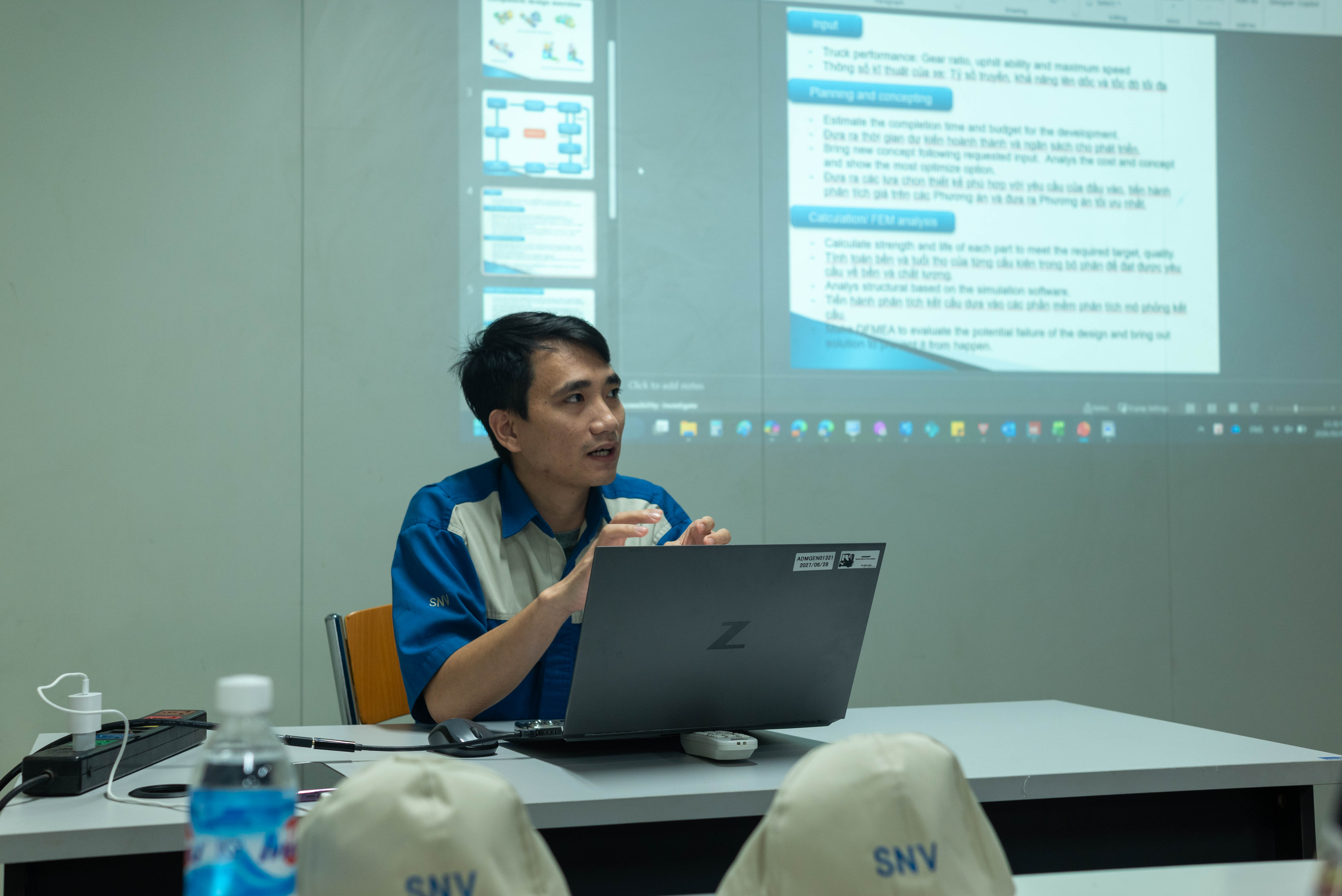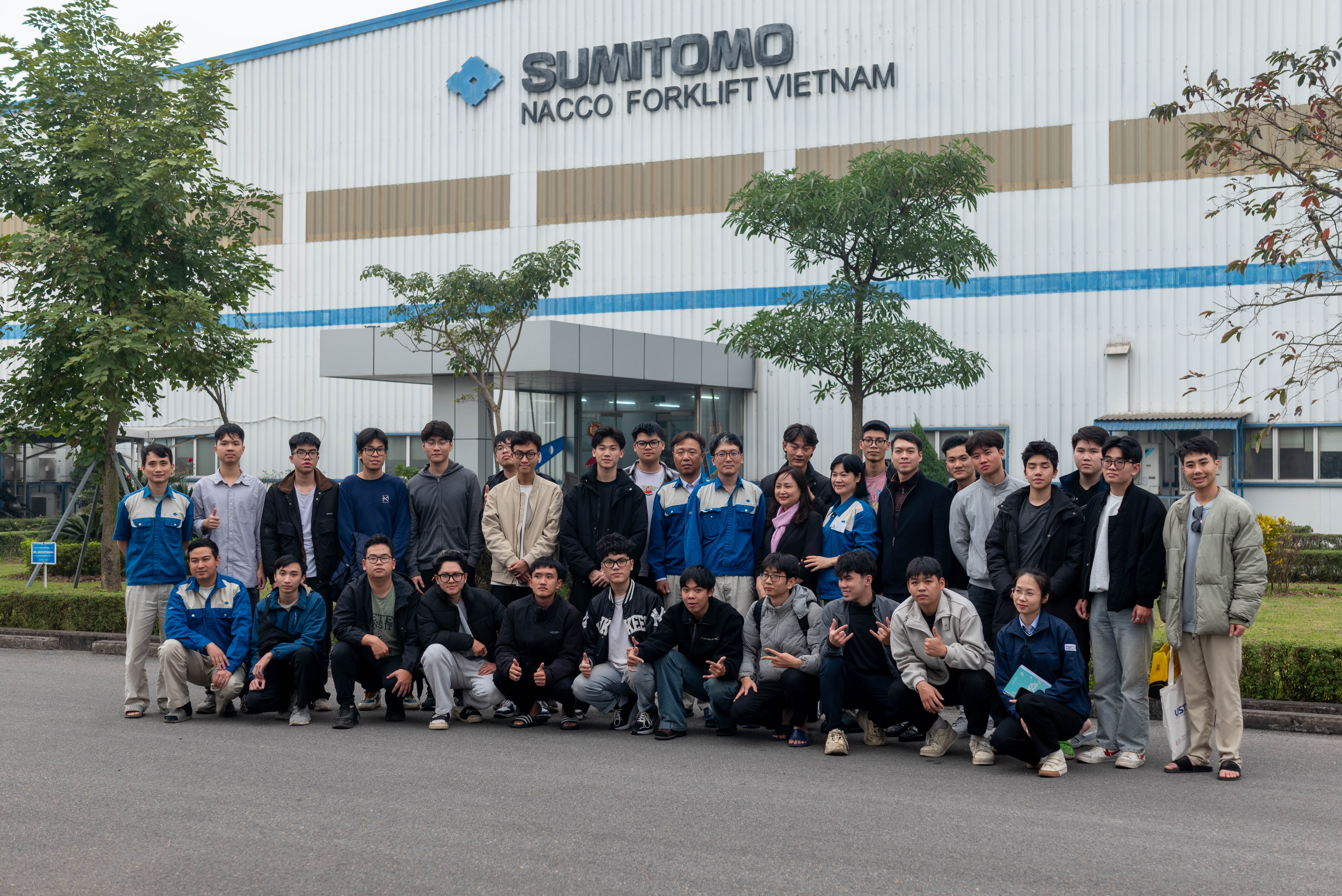 Tiếp đó, tại công ty TNHH Sumitomo NACCO Forklift Việt Nam, đại diện lãnh đạo và các chuyên gia của công ty đã giới thiệu về môi trường làm việc, văn hóa doanh nghiệp, mô hình quản lý, cũng như quy trình thiết kế và thử nghiệm sản phẩm.