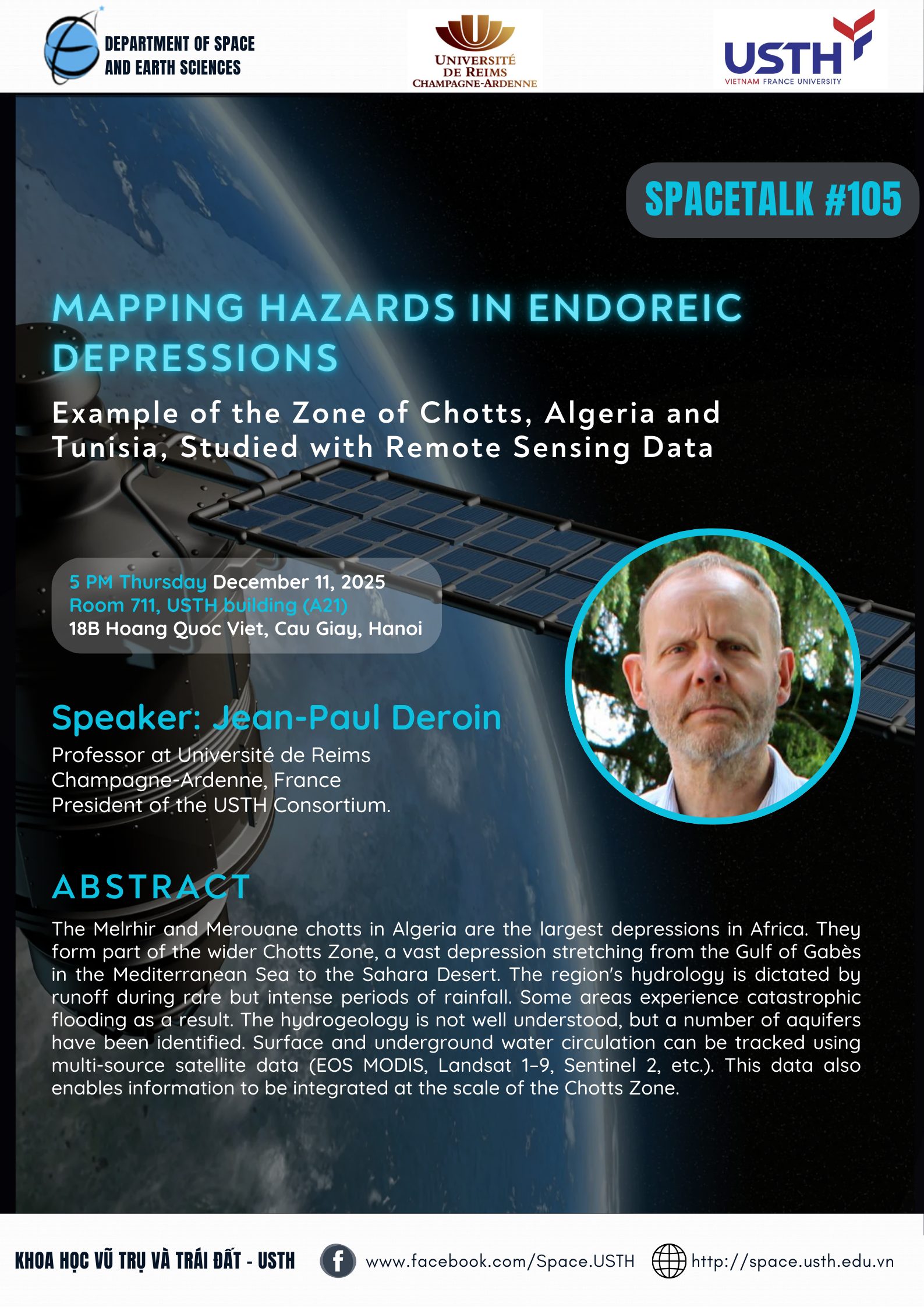 Khoa Vũ trụ và Ứng dụng, trường Đại học Khoa học và Công nghệ Hà Nội (USTH) trân trọng thông báo và kính mời quý vị quan tâm đến dự buổi nói chuyện chuyên đề với chủ đề: “Mapping Hazards in Endoreic Depressions”.