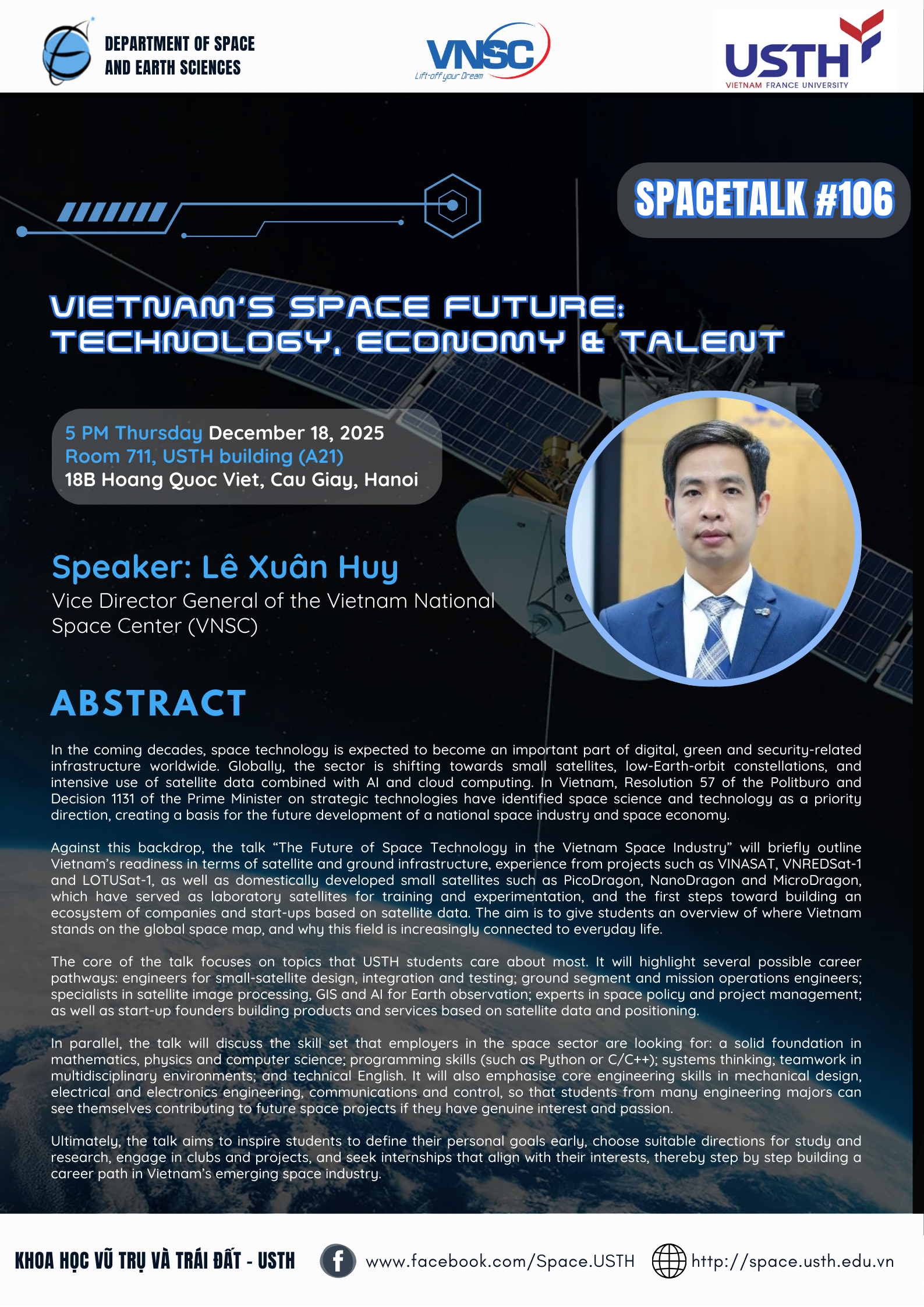 Khoa Vũ trụ và Ứng dụng, trường Đại học Khoa học và Công nghệ Hà Nội (USTH) trân trọng thông báo và kính mời quý vị quan tâm đến dự buổi nói chuyện chuyên đề với chủ đề: “Vietnam’s Space Future: Technology, Economy and Talent”.