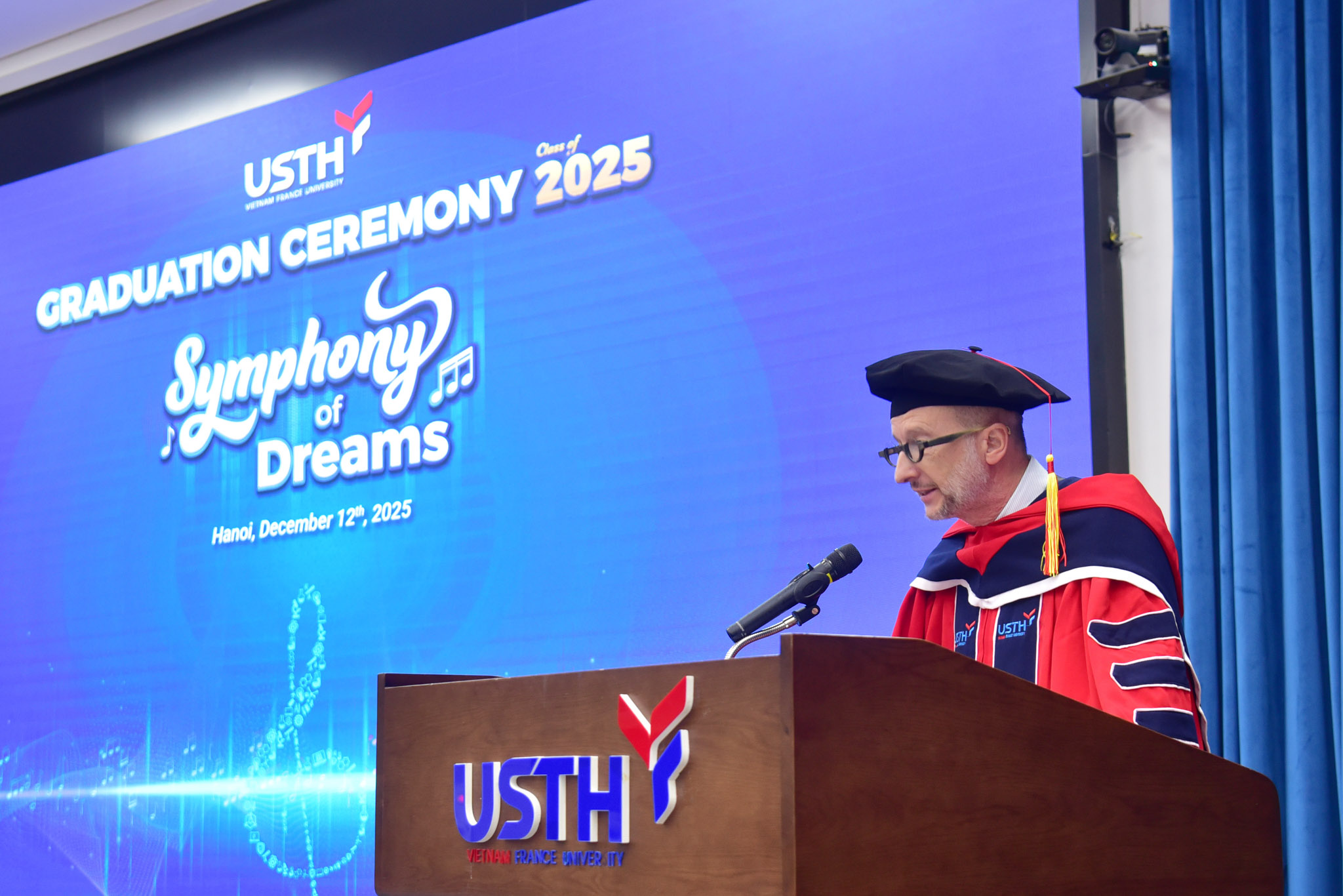 Trong phát biểu chúc mừng, GS.TS. Jean-Marc Lavest bày tỏ niềm tự hào sâu sắc khi được chứng kiến sự trưởng thành của các tân tốt nghiệp. Ông khẳng định tấm bằng hôm nay là kết quả của nỗ lực bền bỉ và tinh thần vượt khó, đồng thời là minh chứng cho hành trình không ngừng khám phá tri thức của mỗi sinh viên USTH.