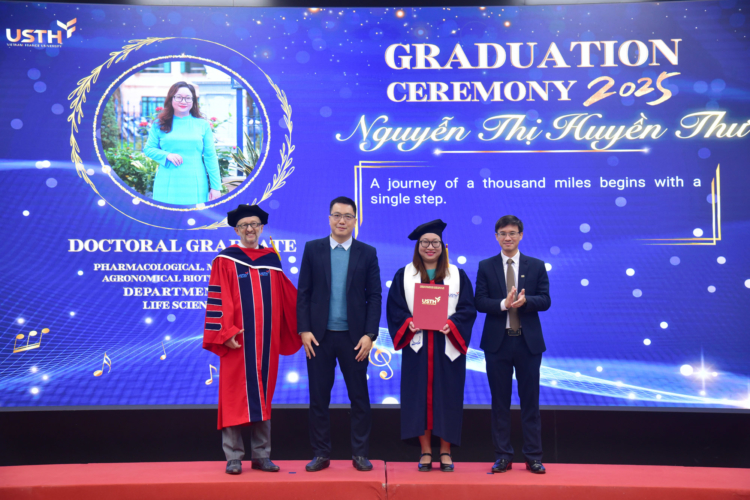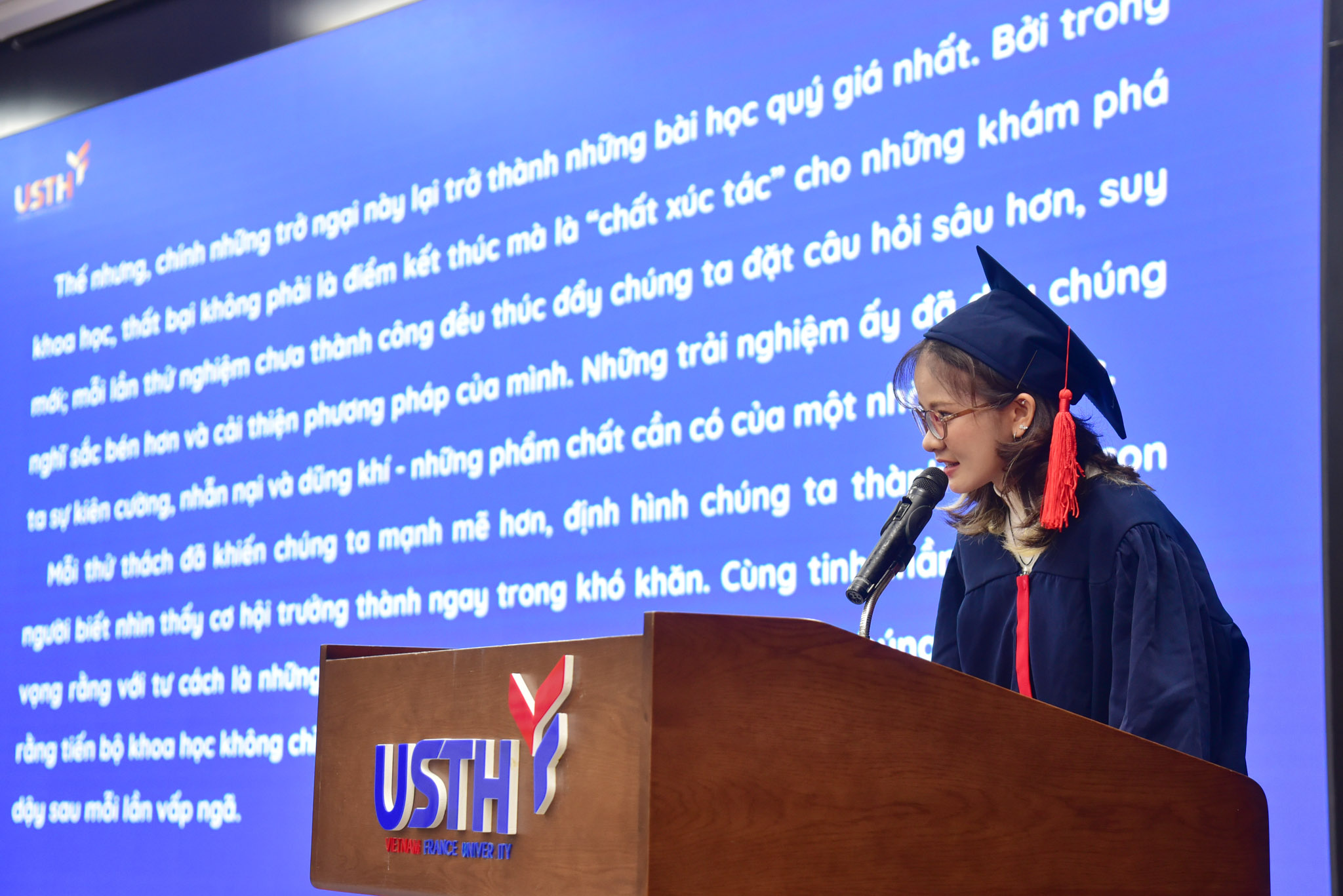 – Tân Thạc sĩ ngành Công nghệ Sinh học, chuyên ngành Y sinh, cựu sinh viên khóa 10 – đã có bài phát biểu đầy xúc động. Thủy bày tỏ niềm tự hào khi được trưởng thành trong môi trường học thuật quốc tế tại USTH, nơi đã rèn luyện tinh thần kiên cường, nhẫn nại và dũng khí – những phẩm chất không thể thiếu của một nhà khoa học. Thủy cũng gửi lời tri ân chân thành đến các thầy cô, gia đình và những người đã đồng hành trong hành trình đầy thử thách nhưng giàu ý nghĩa này.