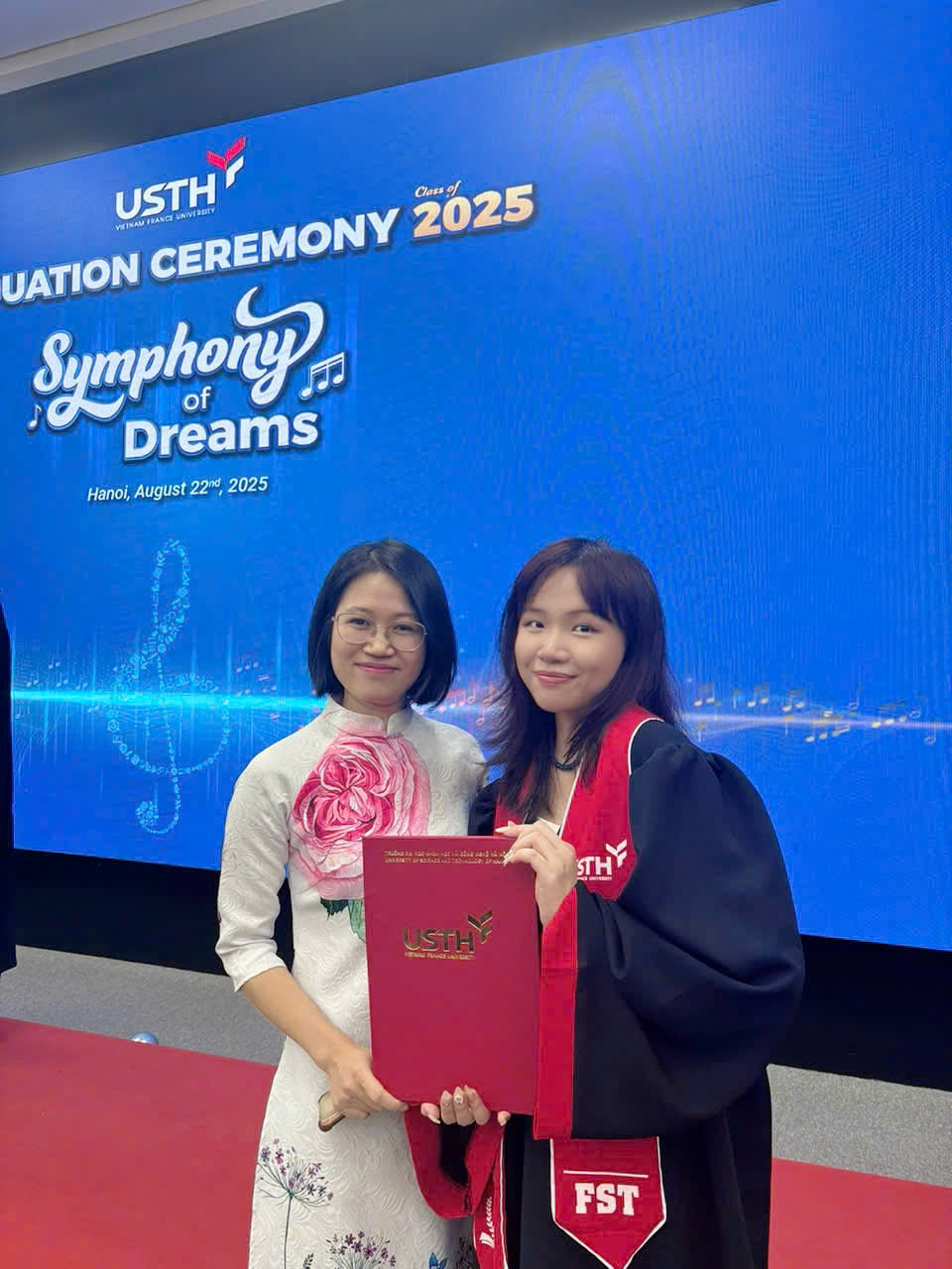 Nhắc đến cô Luyến, Hà không khỏi xúc động và tự hào: “Ở USTH, không chỉ riêng em, mà các bạn xung quanh em cũng đều được trao quyền chủ động, đặc biệt trong các hoạt động học thuật và nghiên cứu. Trong lần tham gia hội thảo, từ mục tiêu nghiên cứu, cách triển khai, cách trình bày poster và cả việc đứng trước hội đồng để trả lời phản biện, em đều là người tự quyết định. Cô Luyến là người hướng dẫn, góp ý và đồng hành, nhưng cô không làm thay. Em phải chịu trách nhiệm với mọi lựa chọn của mình. Văn hóa trao quyền đi kèm trách nhiệm ấy đã giúp em trưởng thành rất nhanh trong tư duy nghiên cứu và trong cuộc sống của mình.” Hà chia sẻ.