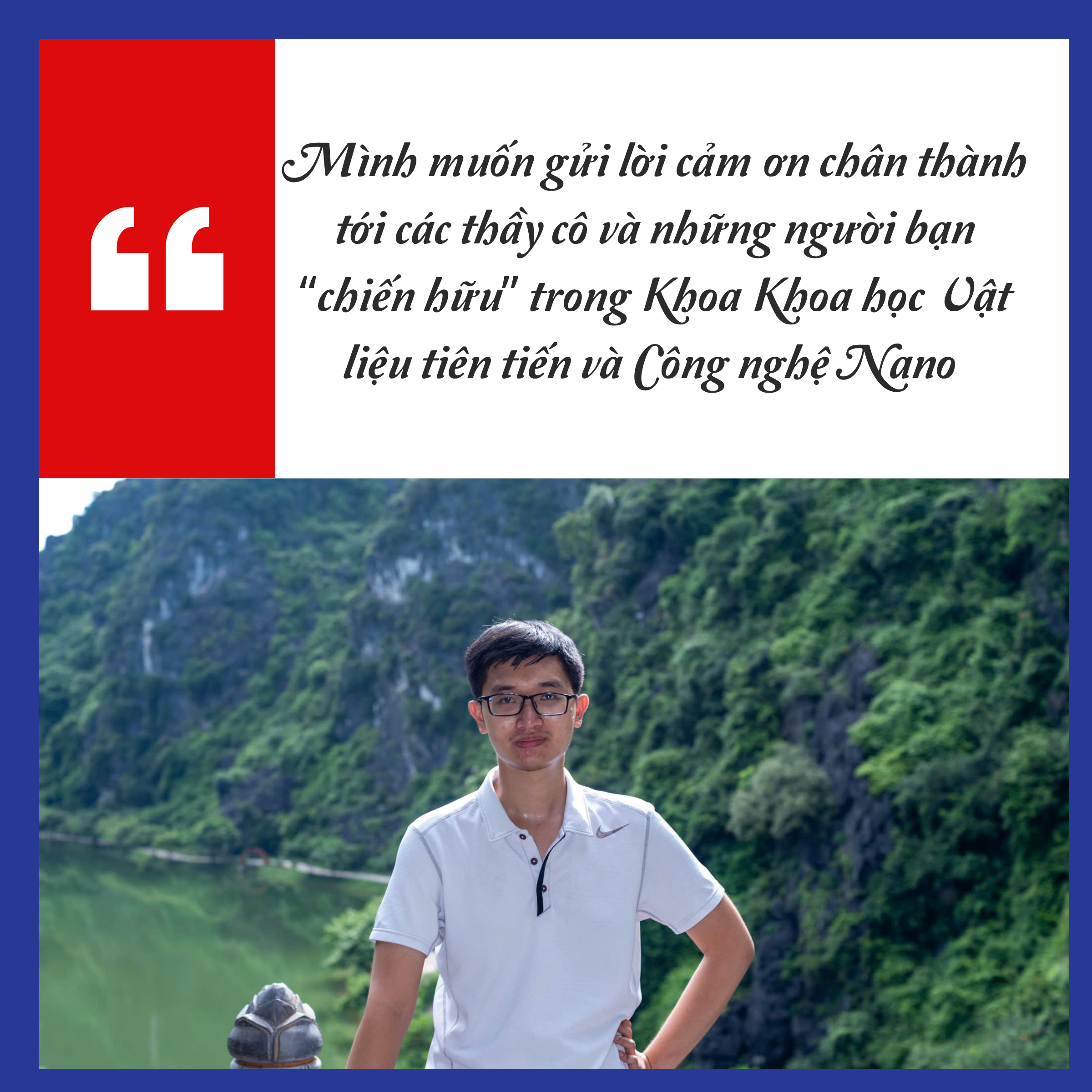 Thái Anh muốn gửi lời cảm ơn chân thành tới các thầy cô, đặc biệt là thầy Nguyễn Văn Quyền, cô Vũ Thị Thu, và những “chiến hữu” trong Khoa Khoa học Vật liệu tiên tiến và Công nghệ Nano. Những lời khuyên, kinh nghiệm và sự động viên từ thầy cô và bạn bè đã giúp Thái Anh tự tin hơn khi bước vào những thử thách mới.
