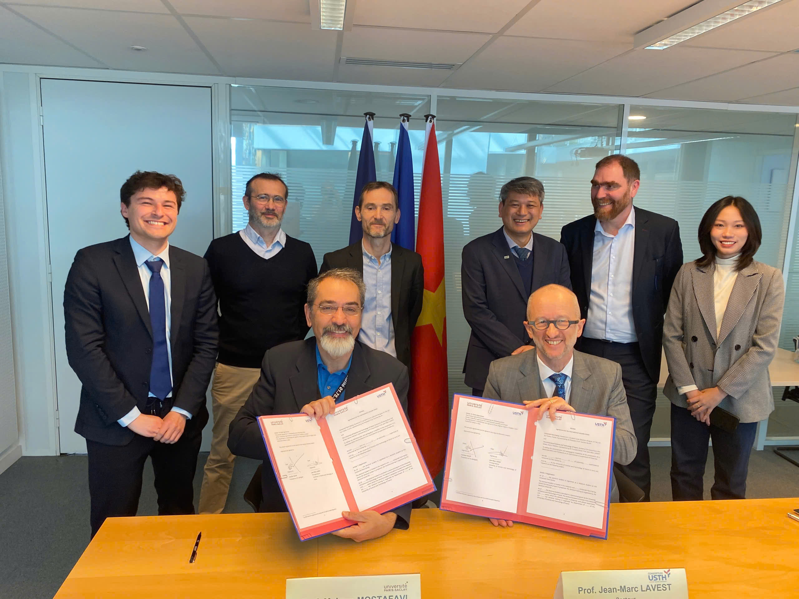 Về phía USTH có: GS. Jean-Marc Lavest – Hiệu trưởng chính; PGS.TS. Trần Đình Phong – Phó Hiệu trưởng; cùng bà Đinh Thị Hương Giang – chuyên viên Phòng Nghiên cứu, Đổi mới và Hợp tác quốc tế.