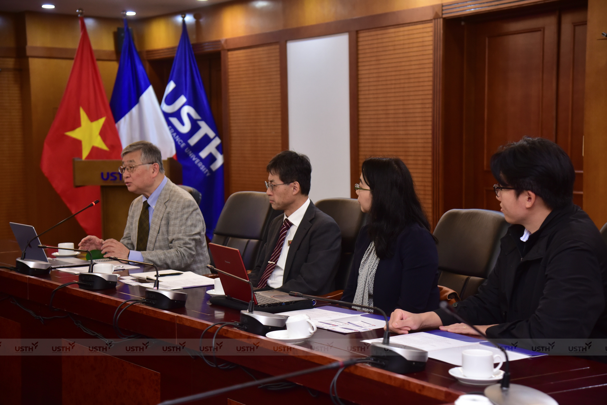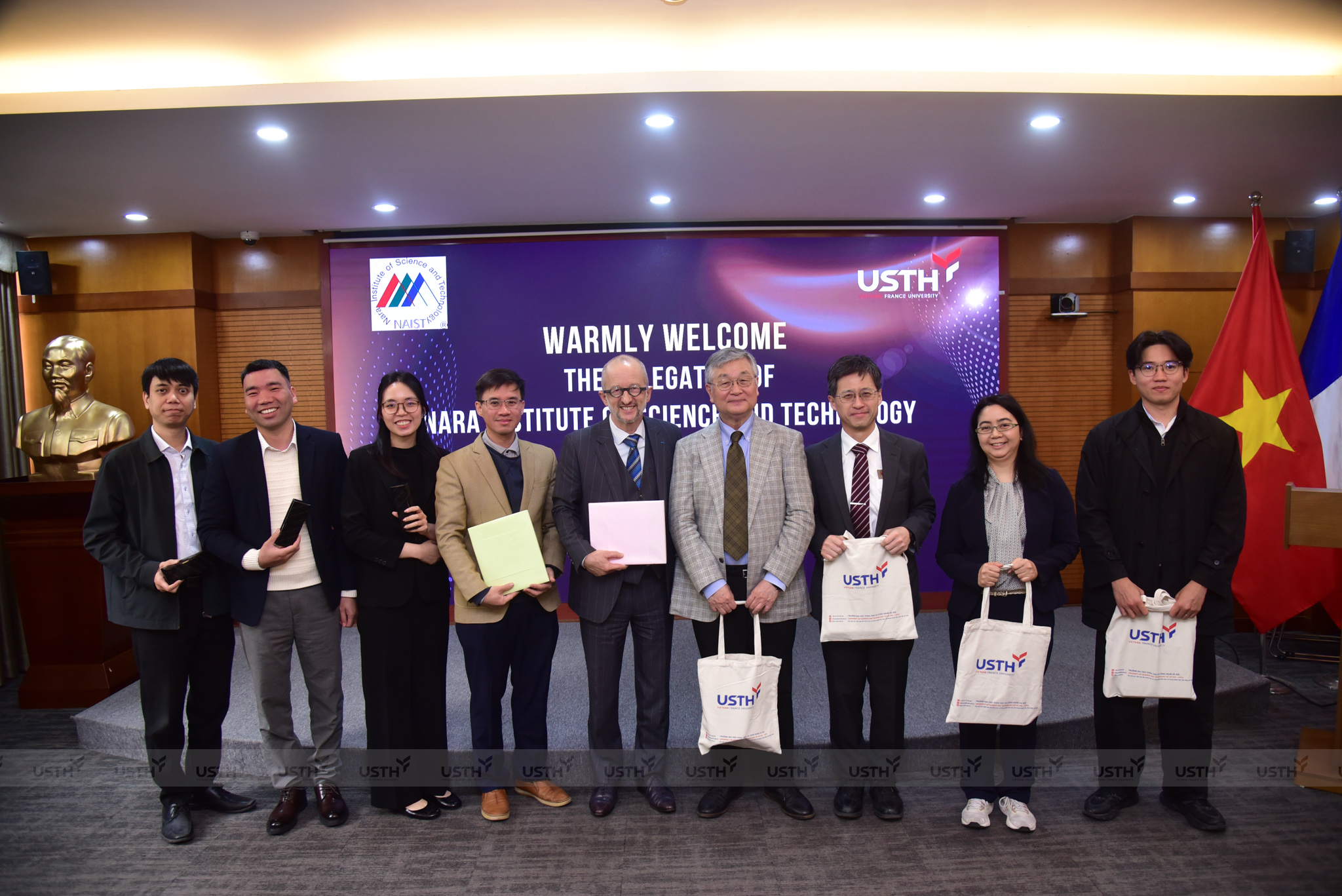 Đoàn đại biểu NAIST tham dự buổi làm việc gồm GS. Hisaji Maki – Phó Giám đốc Sáng kiến Phát triển Lãnh đạo Toàn cầu; GS. Yasumasa Bessho – Chủ tịch Ủy ban Quốc tế, Khoa Sinh học; GS. Sakriani Sakti – Trưởng Phòng thí nghiệm Tương tác Người – AI; TS. Hoai Luan Pham – giảng viên Khoa Kiến trúc Máy tính. Về phía USTH có GS.TS. Jean-Marc Lavest – Hiệu trưởng chính; PGS.TS. Nguyễn Hải Đăng – Phó Hiệu trưởng, Trưởng khoa Khoa học Sự sống; PGS.TS. Nguyễn Quang Huy – Phó Trưởng Khoa Khoa học Sự sống; PGS.TS. Trần Giang Sơn – Trưởng Khoa Công nghệ Thông tin và Truyền thông; cùng bà Đỗ Thị Thùy Trang – Phó Trưởng phòng Nghiên cứu, Đổi mới và Đối ngoại.