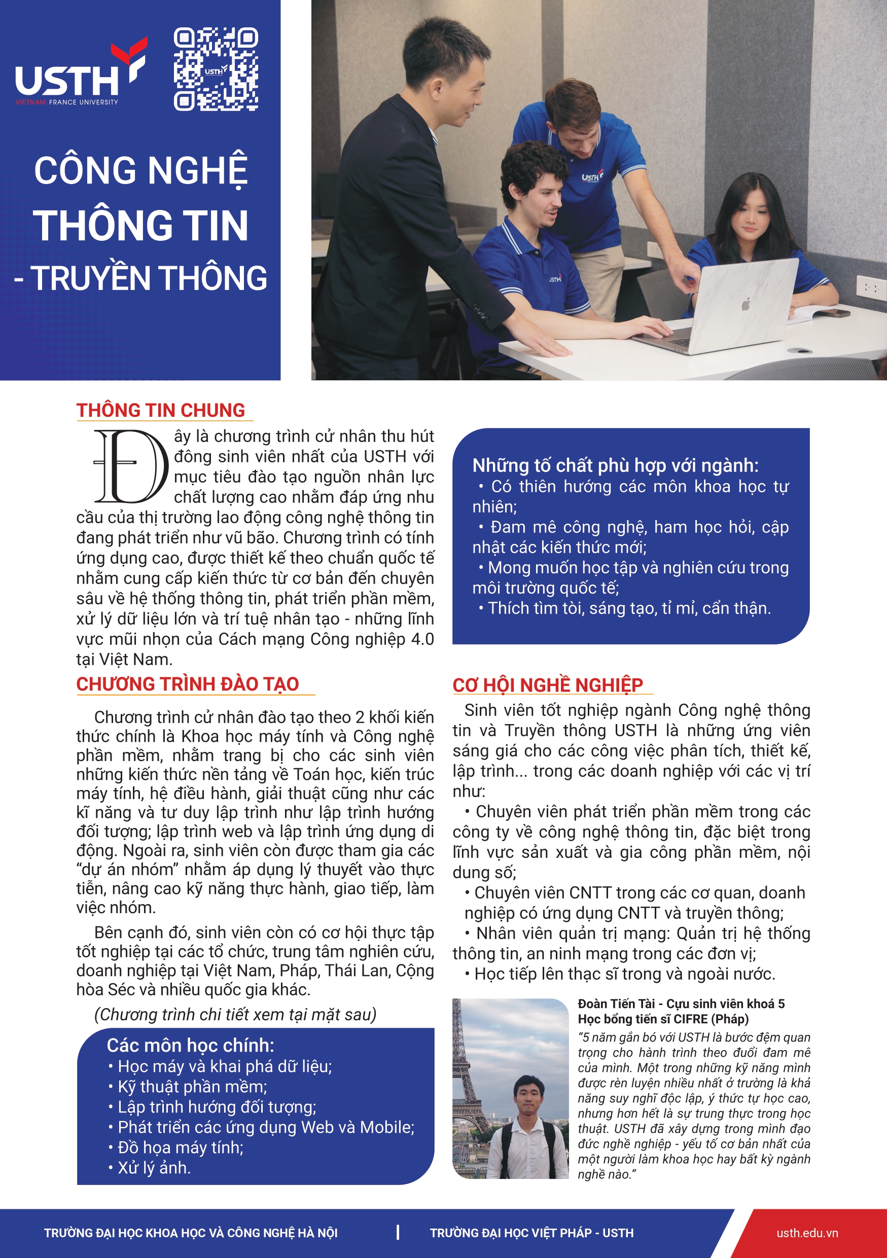 Chương trình cử nhân ngành Công nghệ Thông tin – Truyền Thông (ICT) tại USTH tập trung vào nghiên cứu ứng dụng và công nghệ mới thuộc hai chuyên ngành Công nghệ phần mềm và Khoa học máy tính. Chương trình ICT trang bị cho sinh viên những hiểu biết cơ bản về máy tính và quản trị hệ thống, các kiến thức chuyên nghiệp của hệ thống thông tin, cơ sở dữ liệu trước và cuối cùng quản lý dự án. Ngoài ra, chương trình đào tạo cũng trang bị cho sinh viên khả năng làm việc hiệu quả trong nhóm đa ngành và trong môi trường quốc tế. Sinh viên sau khi tốt nghiệp có thể ứng tuyển ngay vào các vị trí thích hợp trong các ngành công nghiệp hoặc theo đổi con đường nghiên cứu khoa học với những khóa học ở bậc học cao hơn.
