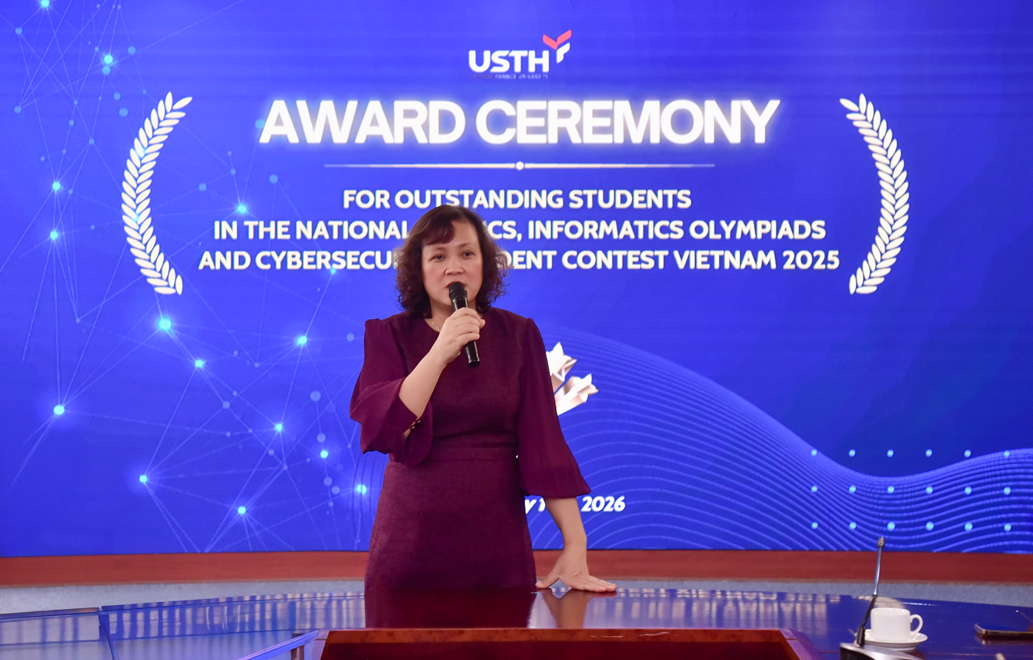 Phát biểu tại buổi lễ, GS.TS. Đinh Thị Mai Thanh – Hiệu trưởng Trường Đại học Khoa học và Công nghệ Hà Nội nhấn mạnh rằng thành tích tại các cuộc thi Olympic Tin học, Vật lý và An ninh mạng mà sinh viên USTH đạt được không chỉ mang ý nghĩa vinh danh cá nhân, mà còn góp phần khẳng định định hướng phát triển nhất quán của Nhà trường trong đào tạo khoa học – công nghệ.